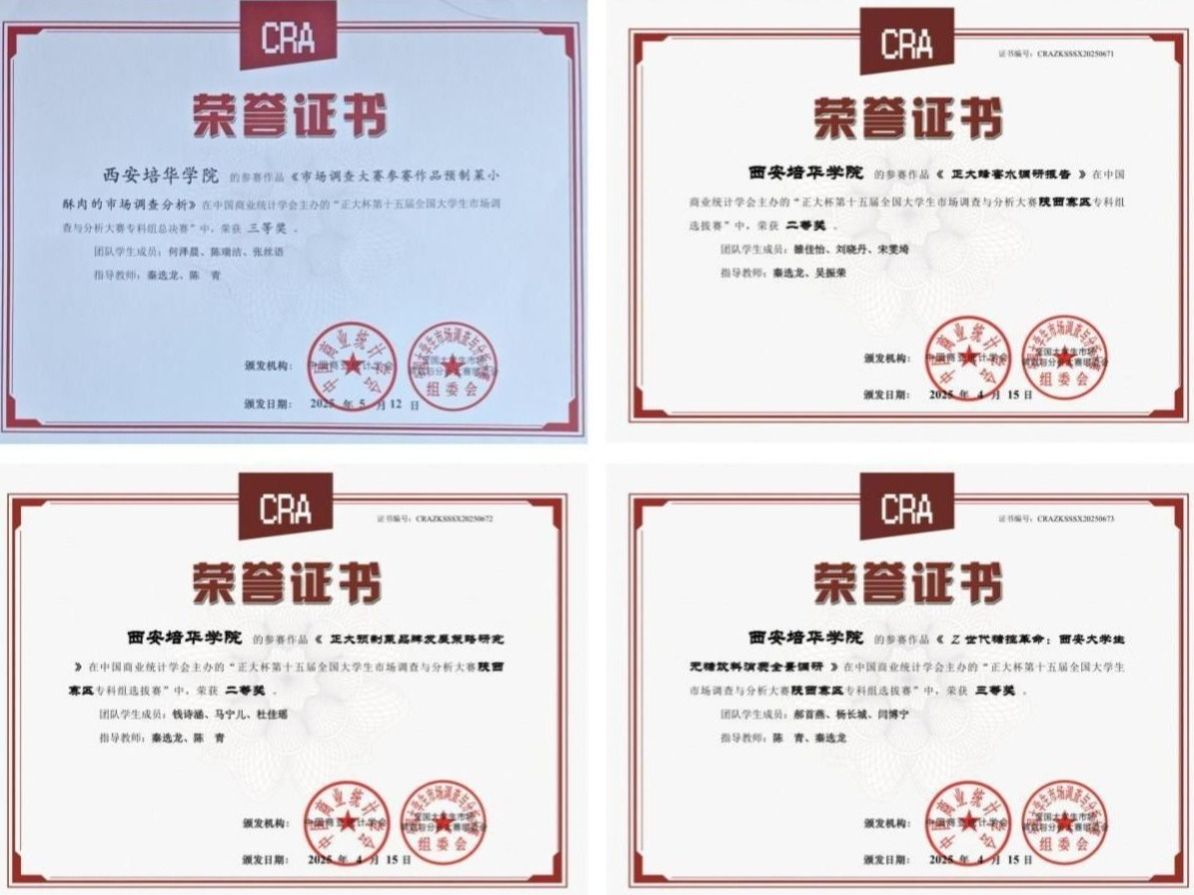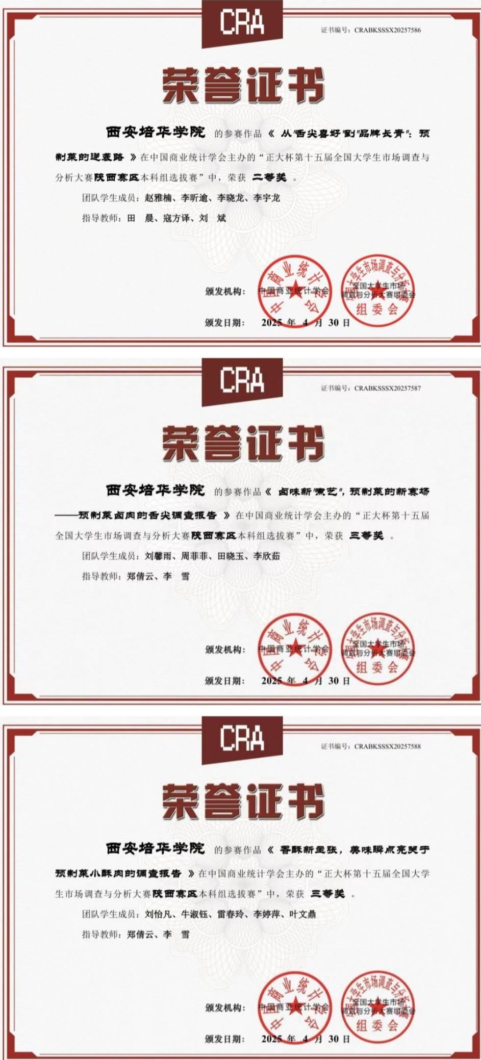 专科组何泽晨、陈瑞洁、张丝语的作品《预制菜小酥肉的市场调查分析》荣获国家级三等奖。雒佳怡、刘晓丹、宋雯琦的作品《正大蜂蜜水调研报告》以及钱诗涵、马宁儿、杜佳瑶的作品《正大预制菜品牌发展策略研究》获得省级二等奖。郝首燕、杨长城、闫博宁的作品《Z世代糖控革命:西安大学生无糖饮料消费全景调研》荣获省级三等奖。