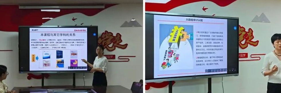 在试讲过程中,各位教师围绕课程定位、教学目标、教学内容设计、教学方法及考核方式等方面进行了系统说课,并选取部分章节进行了现场讲授。成昕怡老师通过丰富案例与互动问答营造良好课堂氛围,在碳金融学课程试讲中,围绕课程定位、考核要求、教学目标等展开说课并对碳金融发展的背景和相关概念进行讲解。高度老师以审计实际案例阐释大数据技术的应用价值,通过社保基金审计、扶贫资金审计、预算审计,这三个案例详细讲解了大数据技术在审计工作中发挥的作用,提升了审计效率。
