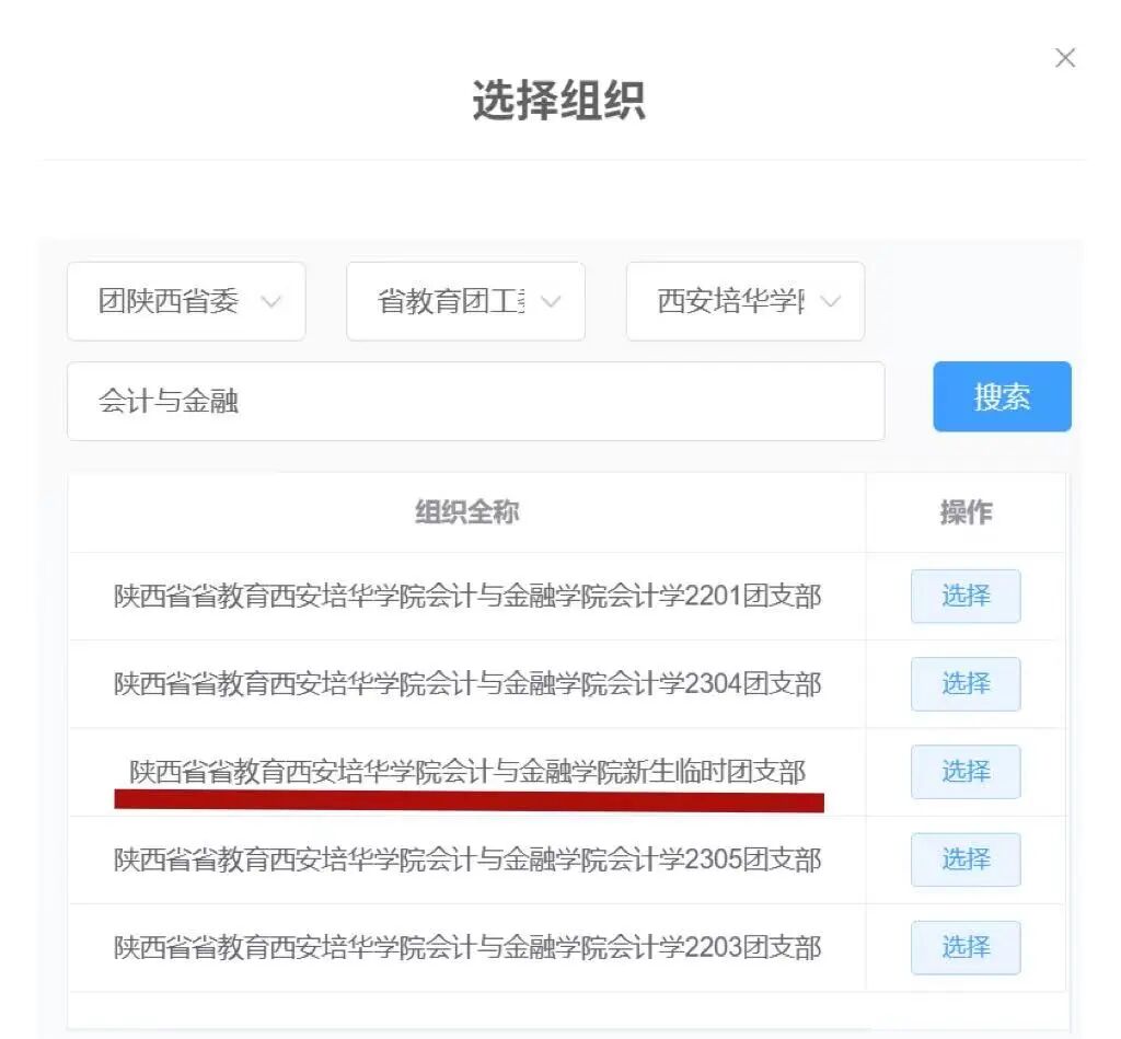 注:转接到各学院所在的新生团支部,切记不能直接转入校团委,否则无法准确二次分配。转到会计与金融学院团总支的同学撤销申请,再申请转入临时支部。
