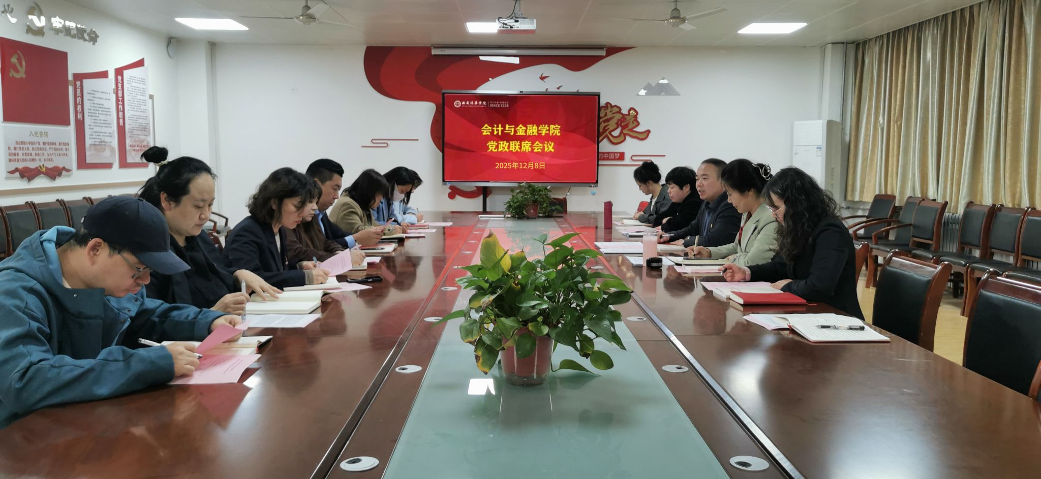 2025年12月8日下午,西安培华学院会计与金融学院在博远楼2115会议室召开2025年第十次党政联席会议。会议紧扣年终收官关键节点,统筹部署审核评估验收、教学建设、产学研融合等五大重点工作,明确任务分工与推进要求。学院党委书记兼行政副院长刘斌主持会议,院长吴旺延、副院长孟君、院长助理吴春娜、党委副书记高乐及周嫚等领导班子成员参会。