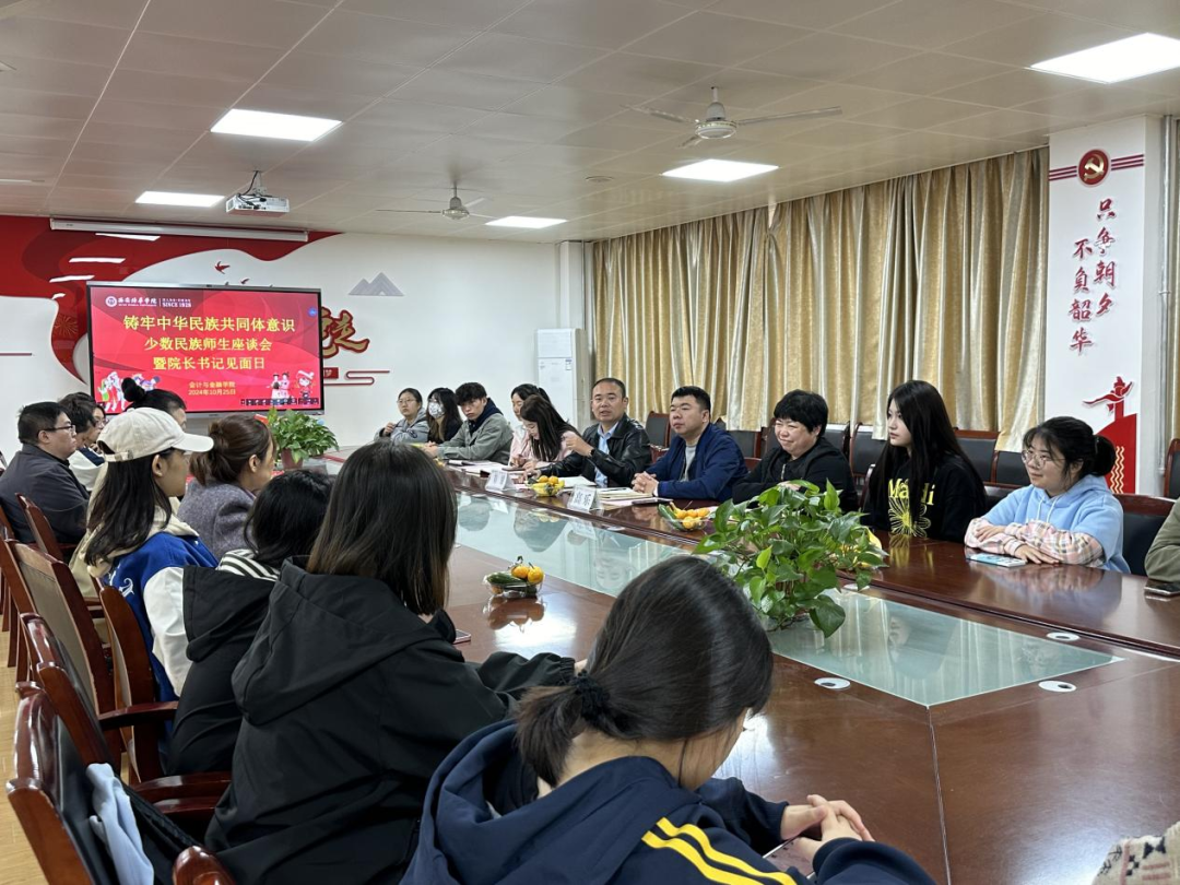 为铸牢中华民族共同体意识,推动学院民族团结进步事业的发展,加强学院领导、教师与少数民族学生之间的沟通与联系,会计与金融学院于2024年10月25日12:10,在博远楼2115会议室举办了以“铸牢中华民族共同体意识”为主题的少数民族师生座谈会暨院长书记见面日活动。