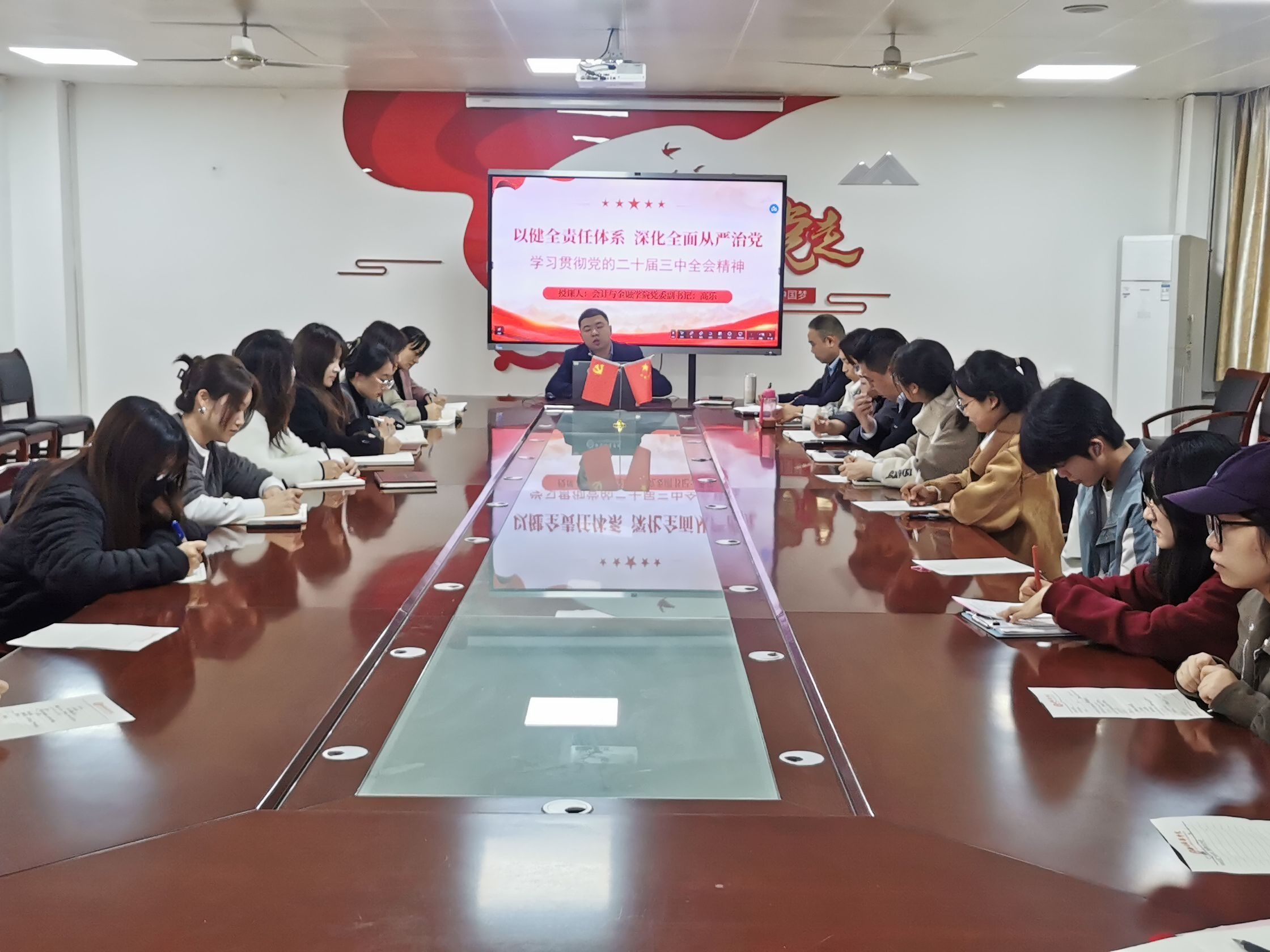 会计与金融学院党委书记兼行政副院长刘斌在博远楼2115会议室,以学习二十届三中全会精神为中心展开,为各支部书记以及师生代表带来了一场深刻的党课。他强调党的二十届三中全会提出的新概念、新观点、新论断。这些内容不仅为我们指明了全面深化改革的方向,更为中国特色社会主义制度的完善和发展提供了理论指导和实践路径。我们要将理论与实践相结合,推动学院各项工作再上新台阶。