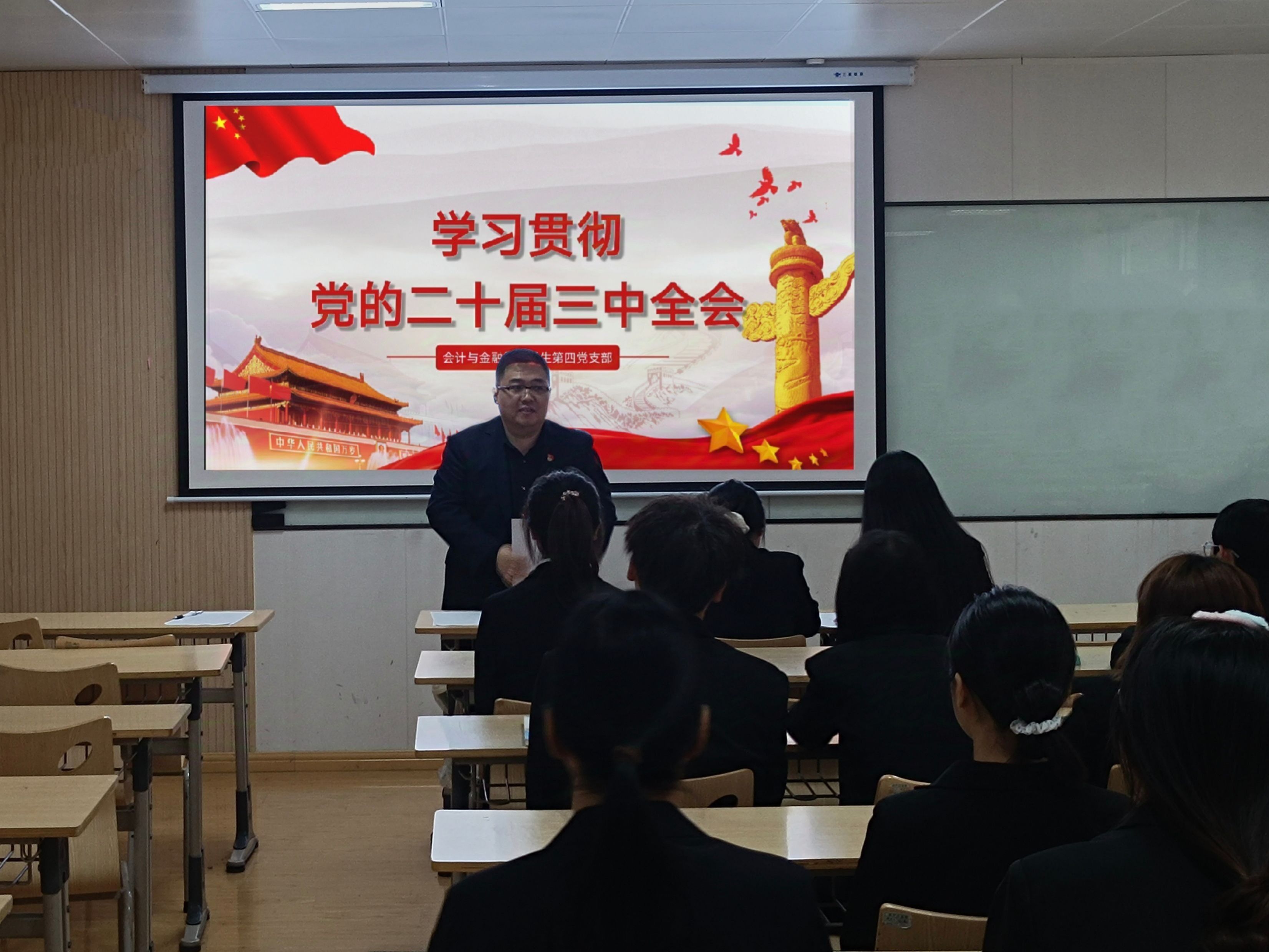 会计与金融学院学生第四党支部开展“学习贯彻党的二十届三中全会”支部书记讲党课活动。支部书记张超老师围绕党的二十届三中全会的情况简介、背景与意义、进一步全面深化改革要求和任务分析等方面阐述。他强调,我们要紧密团结在以习近平同志为核心的党中央周围,坚定信心、锐意进取,为实现中华民族伟大复兴的中国梦不懈奋斗。