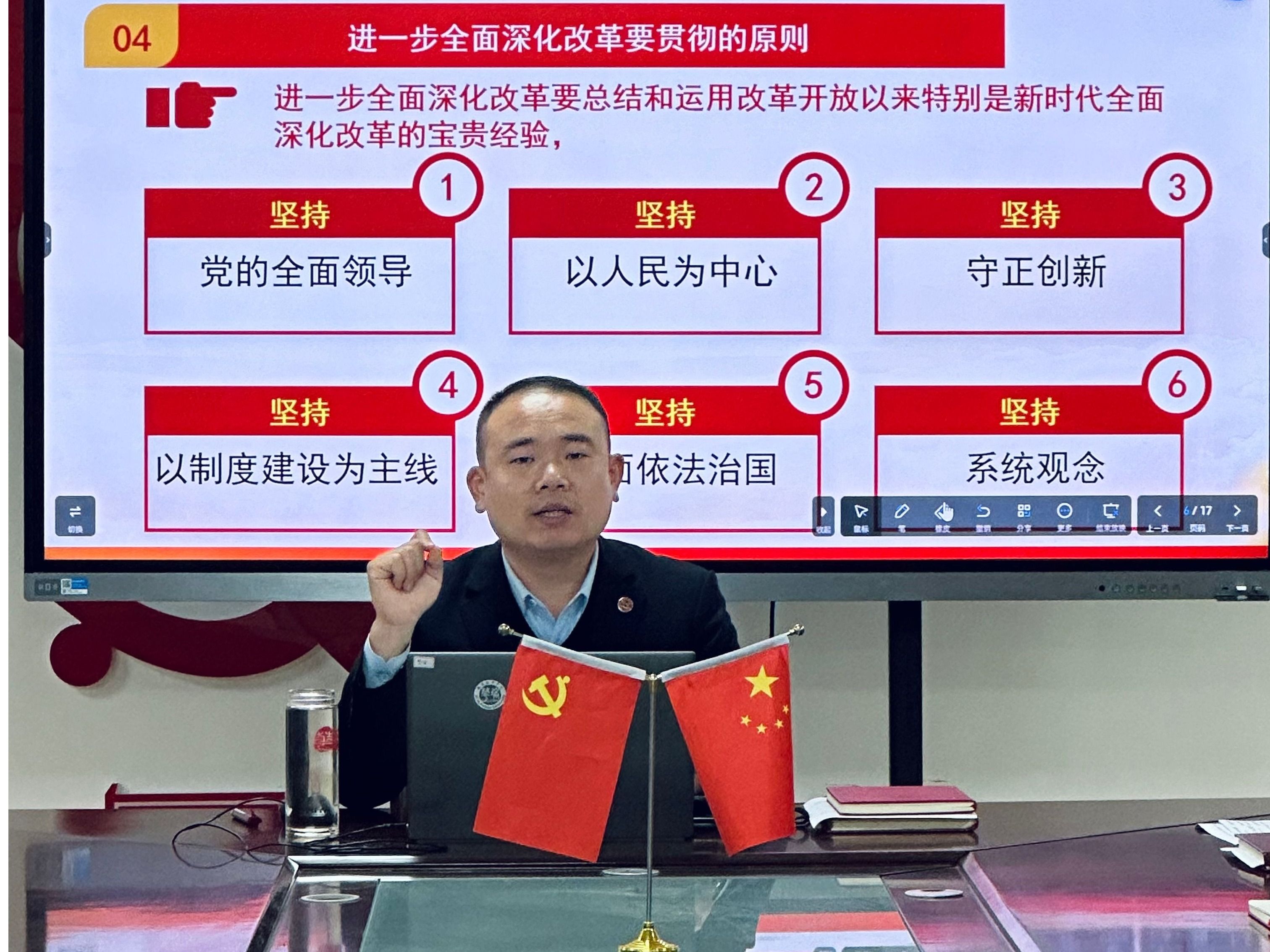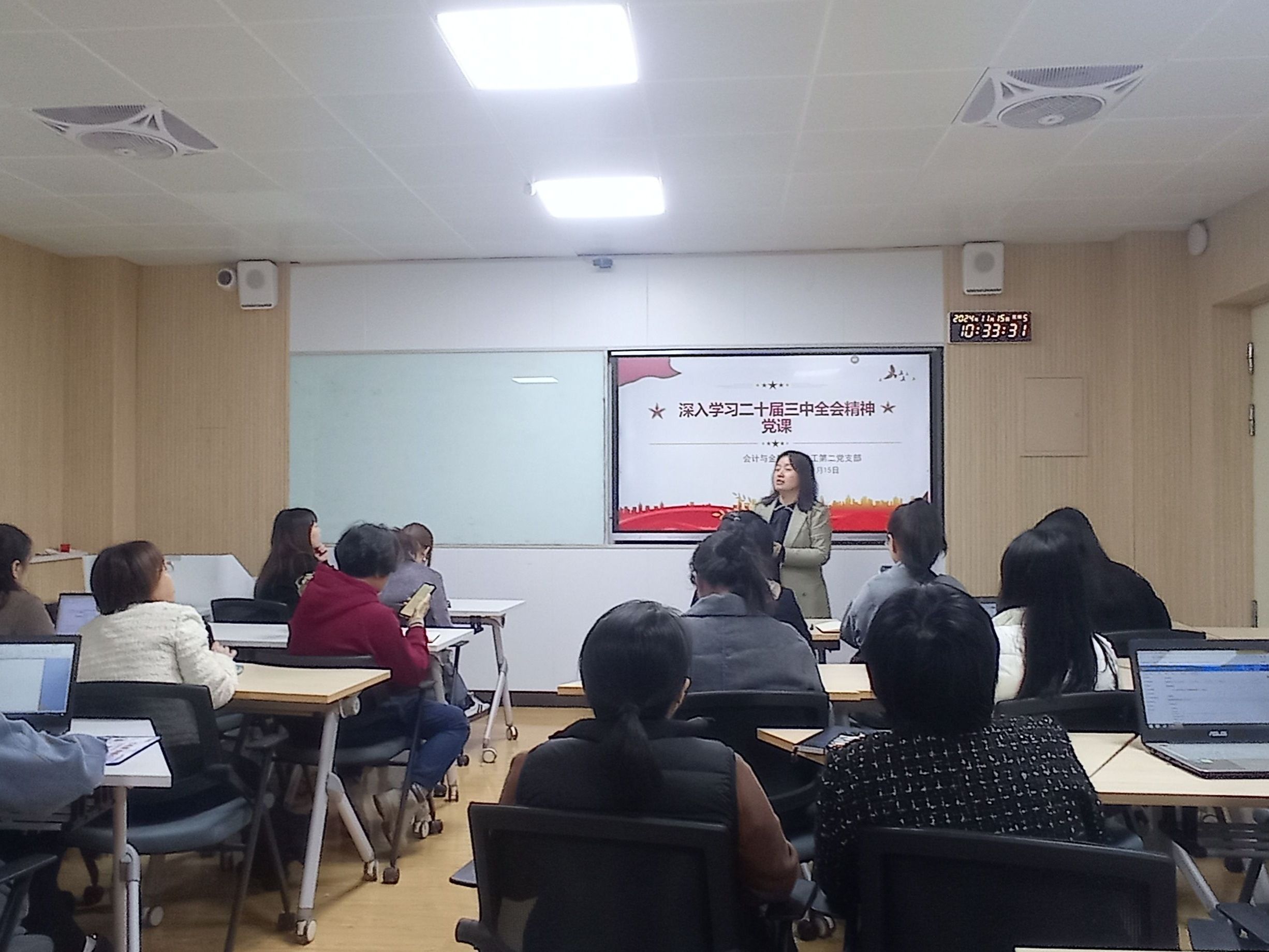 会计与金融学院教工第二党支部书记原亚丽老师于11月12日在2115会议室举行了以“深入学习党的二十届三中全会”的党课活动,解读了《中共中央关于进一步全面深化改革、推进中国式现代化的决定》。原亚丽老师强调了全面深化改革对于推进中国式现代化的重要性,并引导在座的党员同志们积极投身于实践,为实现中华民族的伟大复兴贡献力量。