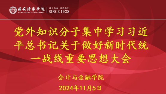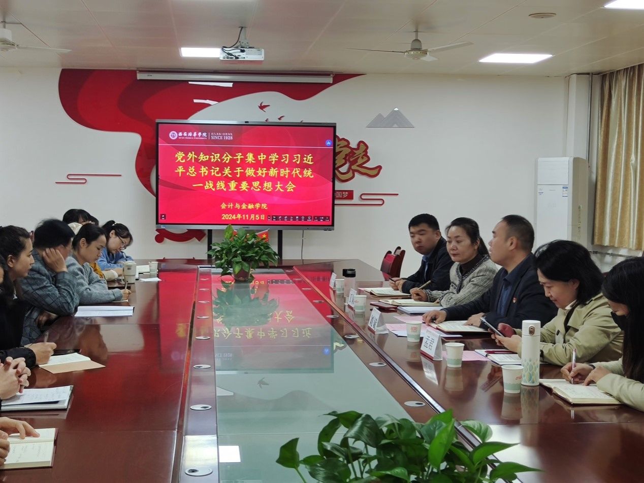 2024年11月5日,会计与金融学院党外知识分子参加集中学习习近平总书记关于做好新时代统一战线思想大会,会计与金融学院主要领导成员参会。