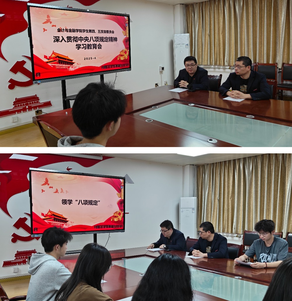 为深入学习贯彻党的纪律要求,强化学生党员作风建设,4 月 9 日,学生第四党支部与第五党支部联合召开中央八项规定精神学习教育会。会议由第四党支部书记张超领学,第五党支部书记乔安结合大学生实际展开实践讨论,两支部党员骨干参会,以学促行推动校园清风建设。