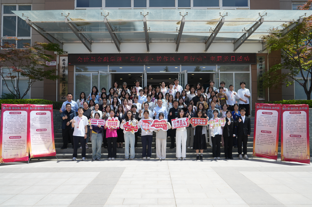 为深入贯彻落实中央八项规定精神,会计与金融学院党委于2025年4月28日上午在博远楼西广场,开展以“学八项·转作风·见行动”为主题的学习教育活动。会计与金融学院党委书记兼行政副院长刘斌、党委副书记高乐、党务行政干事朱梦阳、党务专干孙宝丽、各师生党支部书记及学生党员代表参加了本次活动。