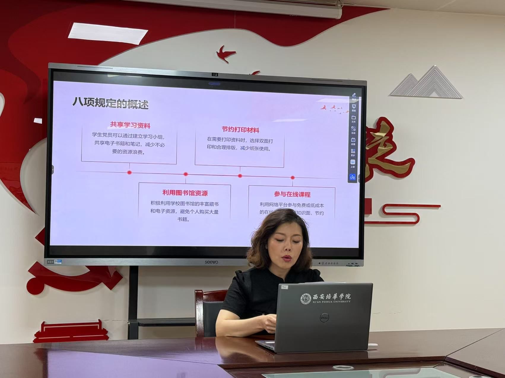 学生第六党支部书记成丽以“八项规定在身边:学生党员如何做到‘勤俭节约、务实担当’”为题,教育学生党员要从身边小事做起,践行勤俭节约的美德,勇于担当社会责任。
