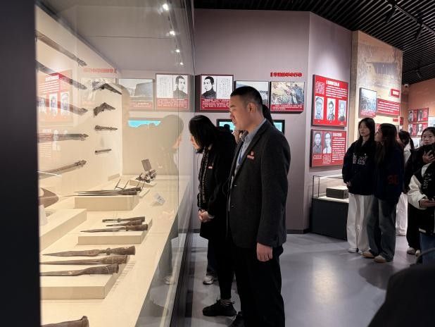 馆内,一幅幅泛黄的历史照片、一件件承载岁月的革命文物、一个个生动还原的战斗场景,全景式再现了1928年渭华起义从筹备、爆发到坚持斗争的波澜壮阔历程。从起义前的秘密发动到武装起义的英勇冲锋,从革命先烈的坚贞不屈到群众支援的鱼水情深,讲解员生动细致地讲述了刘志丹、谢子长等革命先辈带领陕东人民高举革命旗帜,在西北地区打响武装反抗国民党反动派第一枪的英勇事迹,让在场每一位师生都深切感受到了革命先烈为民族解放事业抛头颅、洒热血的崇高气节和坚定信念。