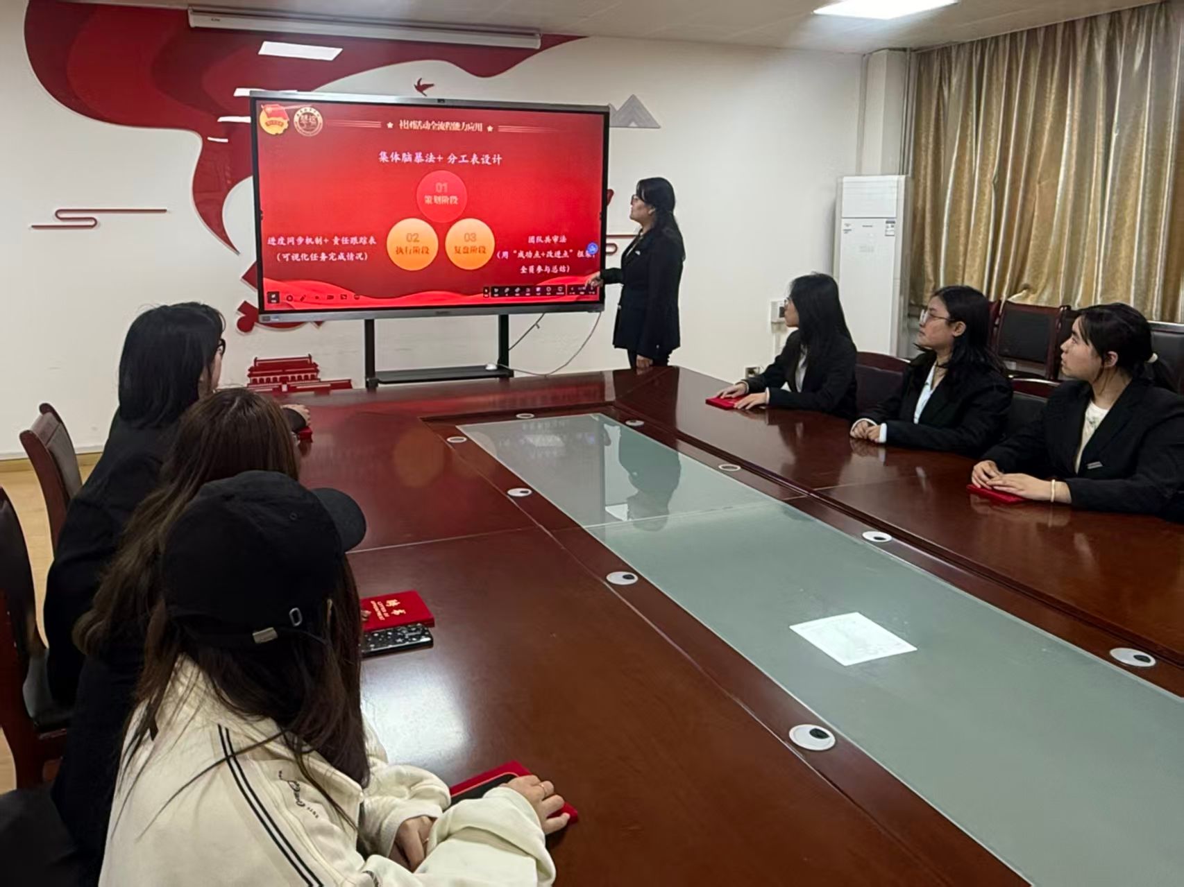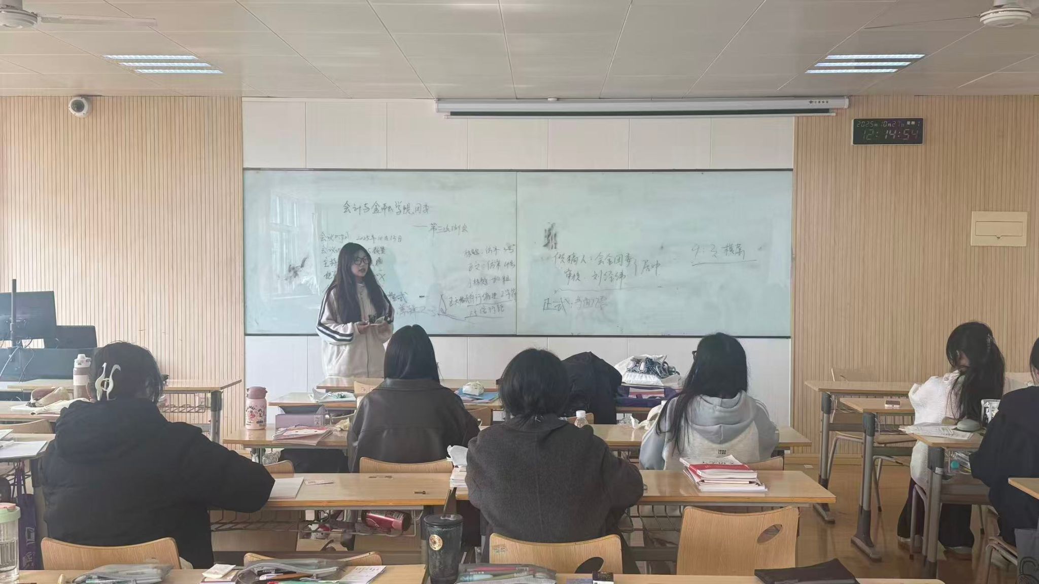 学生会同步开启班长专项培训,由团委副书记兼学生会指导老师李梦丽实施“高阶训练营”。第一期聚焦学风建设、纪律管理、专业团建等基础模块;第二期进阶开展跨部门统筹,强化危机处理与综合表达能力。在小组汇报环节中,各班长围绕“班级团建活动”主题展示创意方案,学生会骨干围绕“金融知识竞赛”主题展开策划路演,最终评选出优秀小组。
