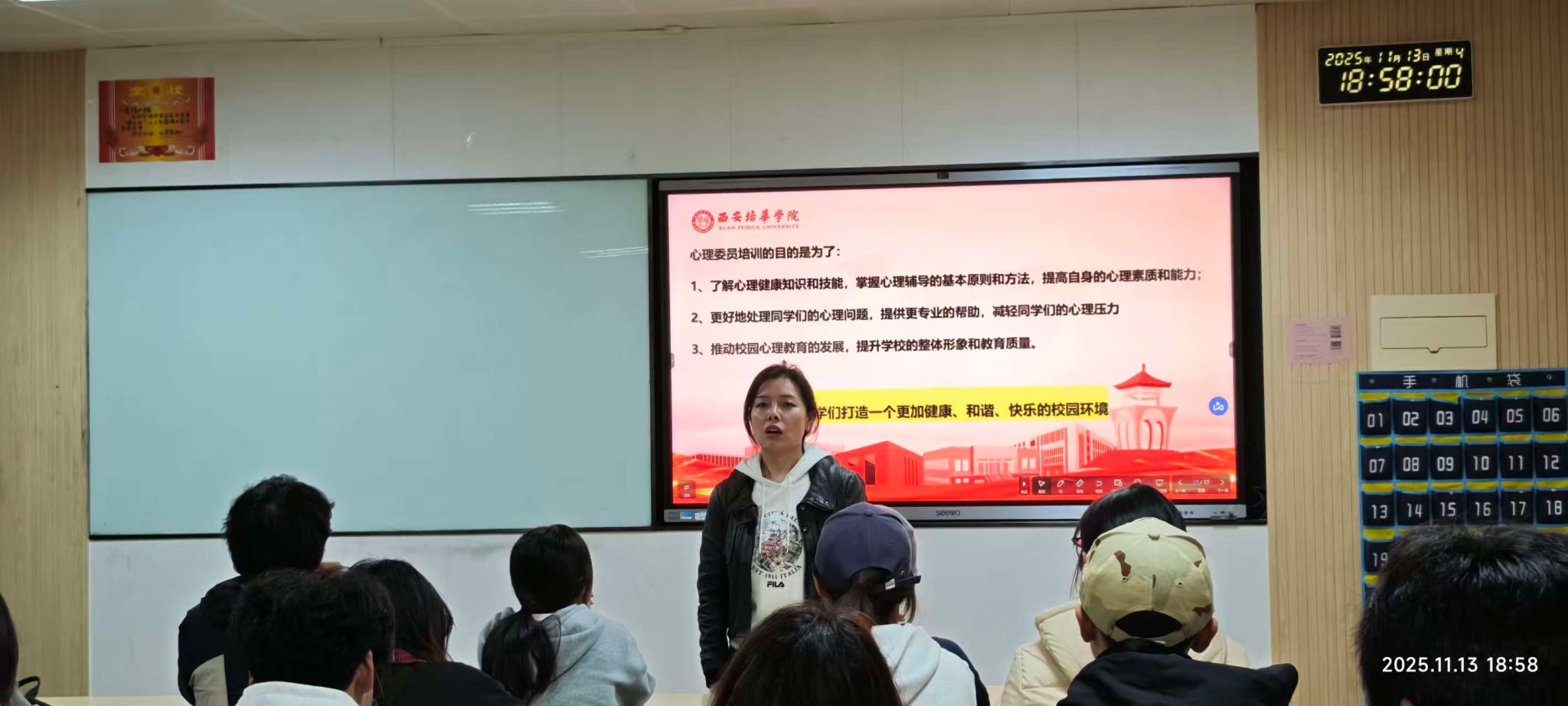学生潜能发展辅导站于博远楼2215、2405教室同步开展两场“心灵守护者”集训,赵娅囡、成丽老师分别为2025级、2024级心理委员授课。培训明确心理委员在班级“四层五级”防护网中的多重角色,讲解破冰班会、电影赏析、心理热线推广等工作要点,传授“专注倾听”“我句式表达”等沟通技巧,并设置宿舍矛盾调解模拟环节。培训后,心理委员领取《工作手册》,表示将以专业态度做好班级“隐形情绪守护者”,助力校园心理环境建设。