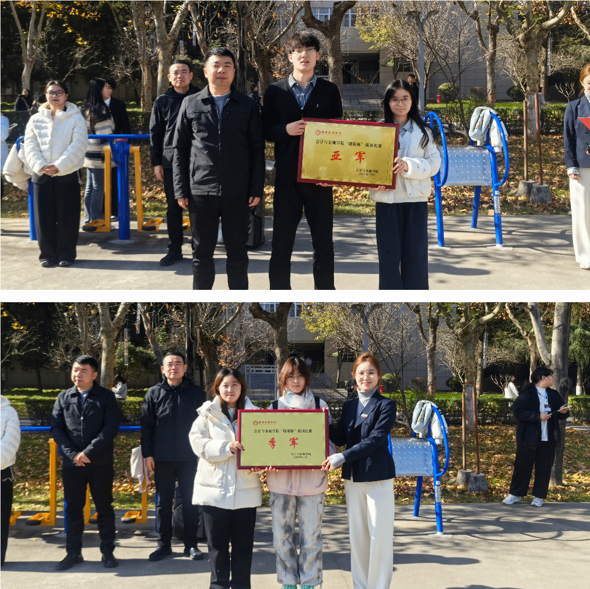 会计与金融学院党委副书记高乐,会计与金融学院团委副书记兼学生会指导老师李梦丽分别为拔河比赛亚军,季军颁奖并合影。