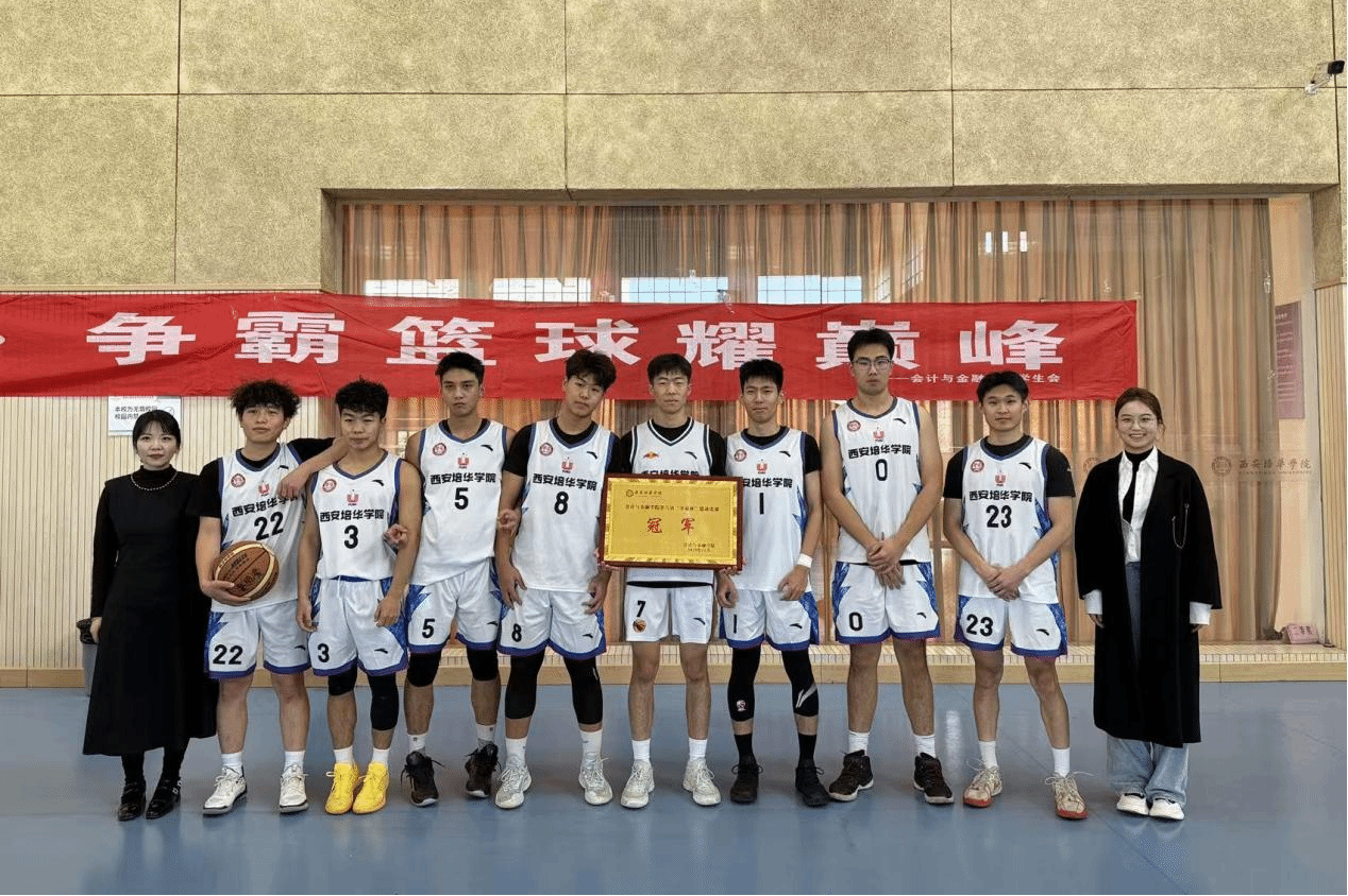 会计与金融学院团委书记刘经纬、会计与金融学院团委副书记兼学生会指导老师李梦丽为篮球比赛冠军队伍颁奖并合影留念。
