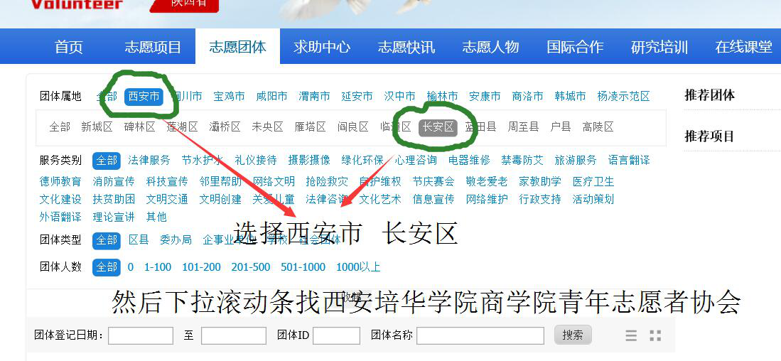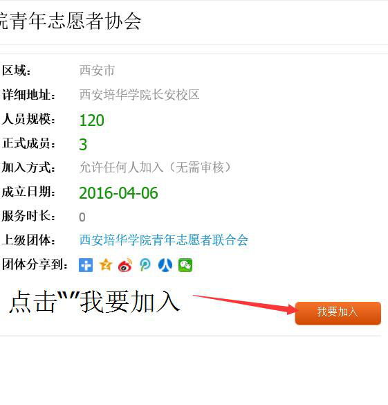 10,选择西安市长安区,然后下拉滚动条找“西安培华学院商学院青年志愿者协会”进入后点击“我要加入”
