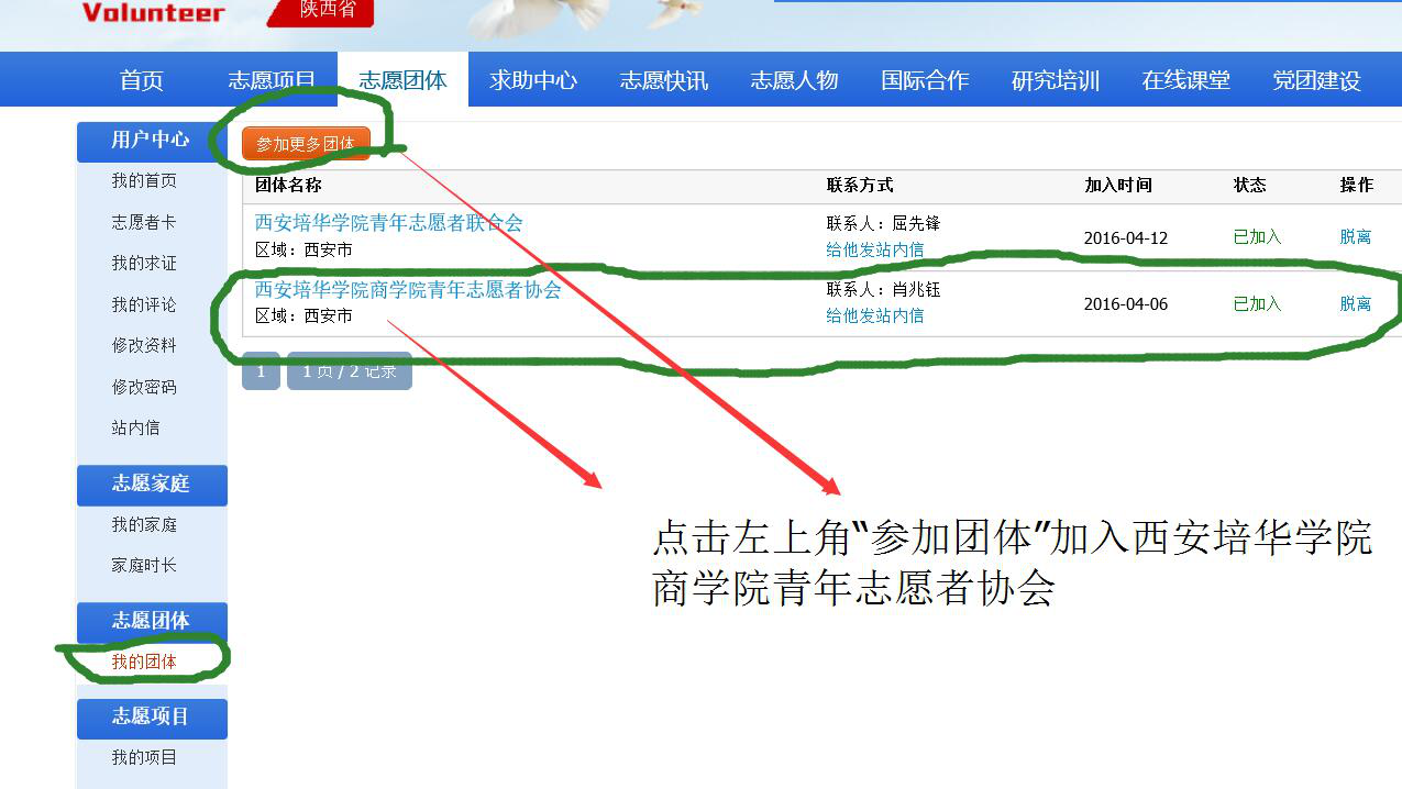 点击我的团体,点击左上角的“加入团体”加入“西安培华学院商学院青年志愿者协会”