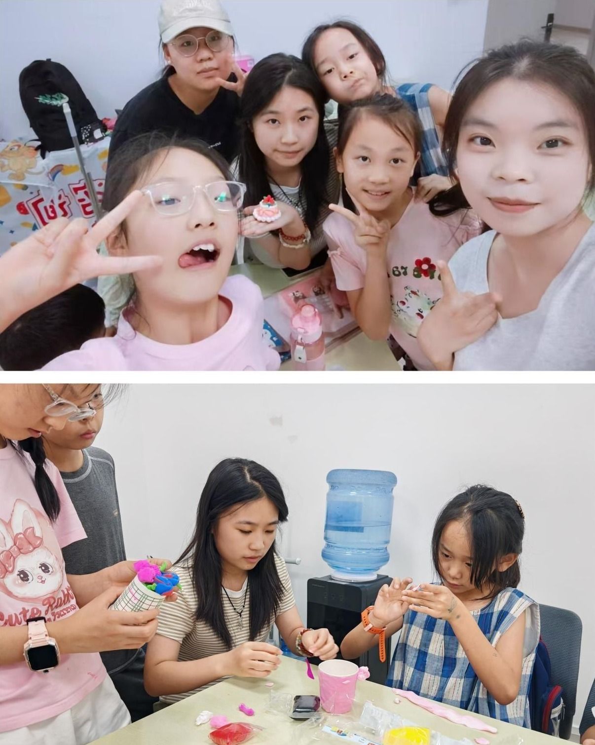 “这个要送给孙老师,她昨天答应我给我带软糖,今天就真的带来了。”“我要给郭老师捏个小蛋糕,她肯定喜欢!”孩子们小心翼翼地把作品装进小纸盒,封口时还不忘贴张画着笑脸的贴纸。