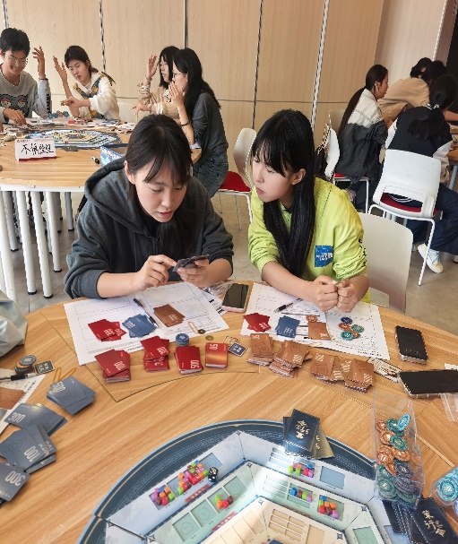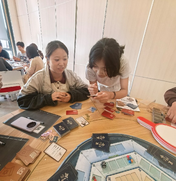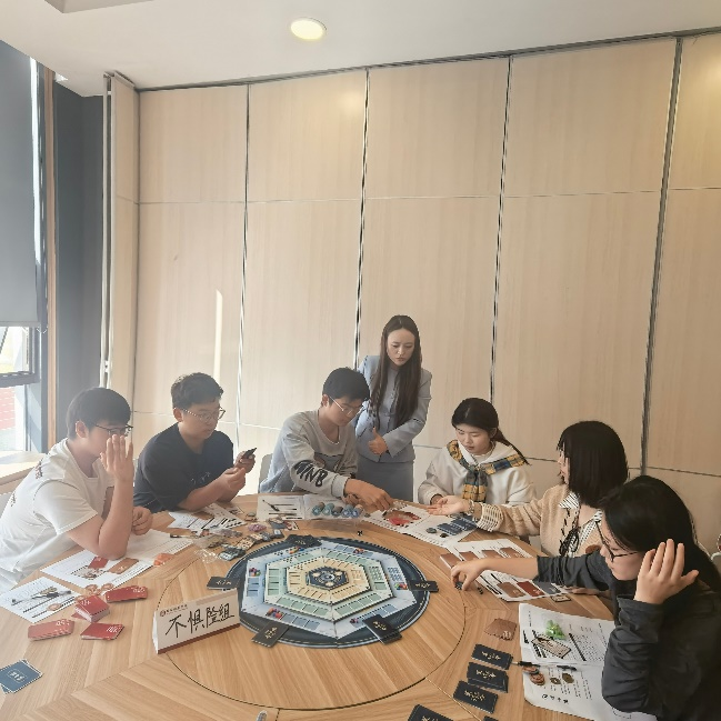 活动伊始,同学们按要求分组、自我介绍,起好组名之后便开始了此次穿越之旅。江老师介绍了沙盘中各个道具的使用方法,每位同学在选择自己的“修行角色”后沙盘体验正式开始。整个活动分为四个部分:初探学府、渐入佳境、深造精进和登峰造极。同学们根据江老师的讲解开始了一轮轮“策行令”的任务,有人果断执行,有人选择观望,每一步都像现实中的决策一样,牵动着“未来”的走向。每轮体验结束,江洁老师都会邀请同学们分享体验感受,让此次活动不仅是“玩”,更是“想”。