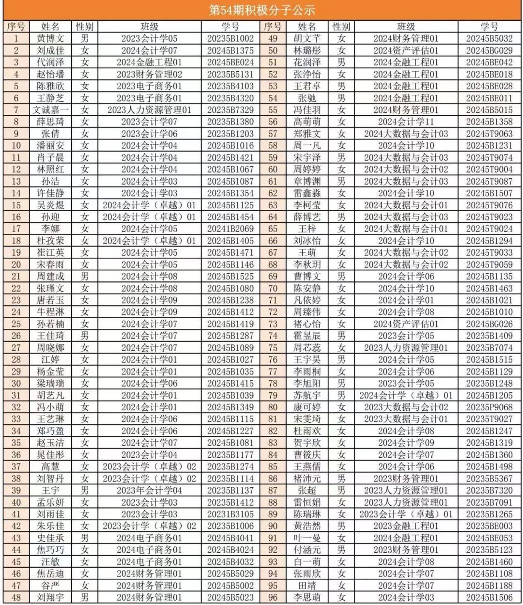 根据《中国共产党章程》、《中国共产党发展党员工作细则》、《中共西安培华学院委员会关于做好2025年下半年发展党员工作的通知》(培华党组发〔2025〕11号)等文件要求,我院团委积极部署、指导各团支部开展“推优入党”工作,本次入党积极分子发展分为入团推优及党员推荐两种方式进行,并且各班级及各组织已严格按照“民主推荐、支部审查、班级公示”流程,完成入党积极分子遴选与公示工作,且公示期间未收到异议。为进一步规范程序,现将入党积极分子汇总名单予以院系层面公示。