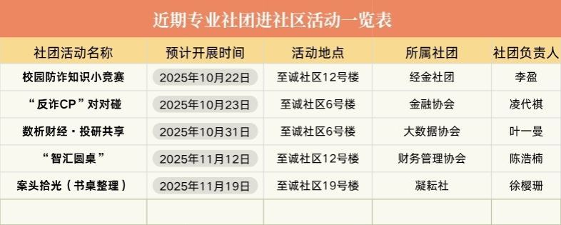 近期专业社团进社区活动详细清单新鲜出炉,快来至诚学生社区解锁专业成长与生活热爱的双重惊喜吧!