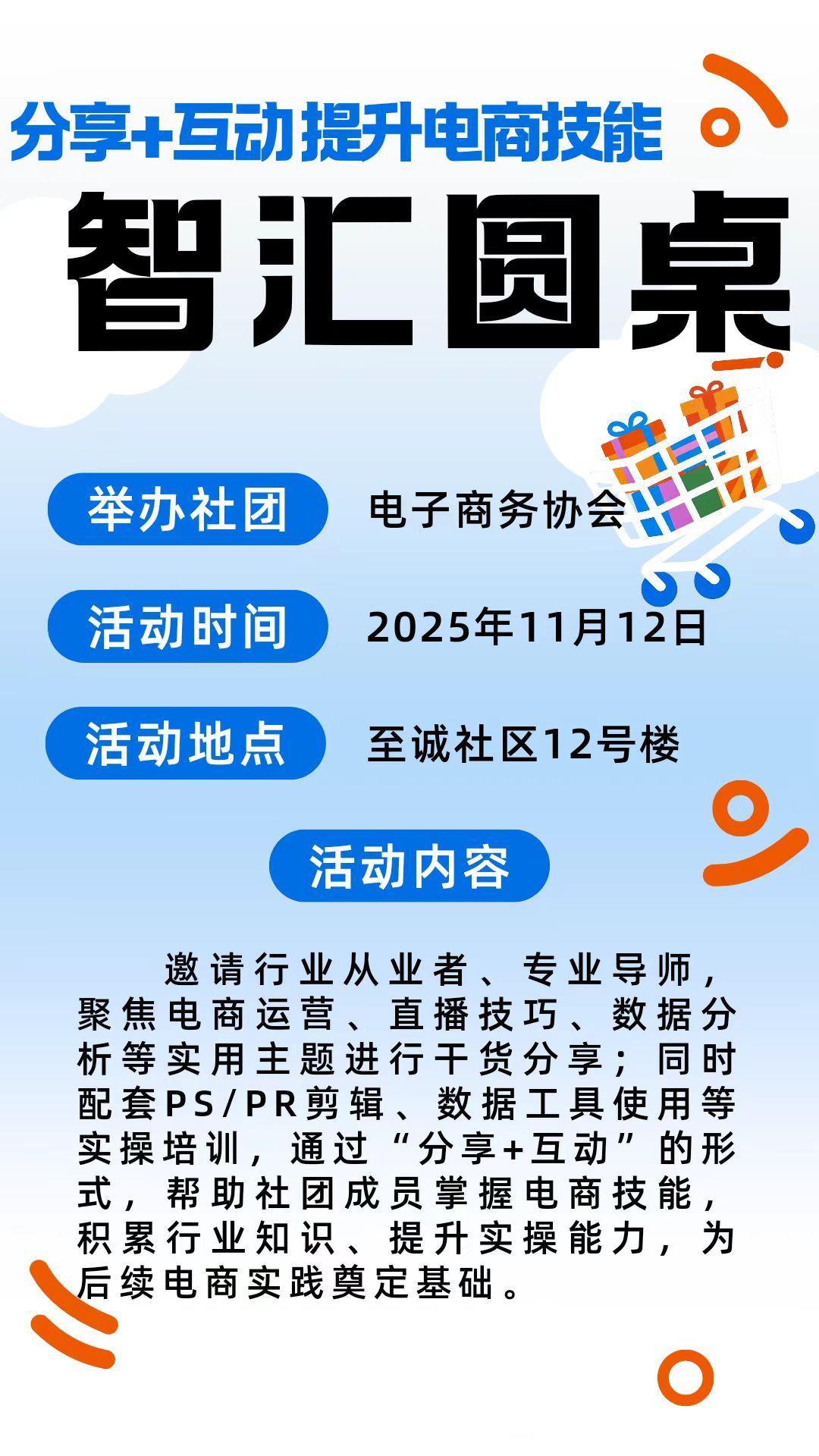 电子商务协会专属干货盛宴来袭。行业导师带你深挖电商运营、直播技巧,实操培训助力技能飙升。助力社团成员夯实电商技能,为电商实践筑牢根基。