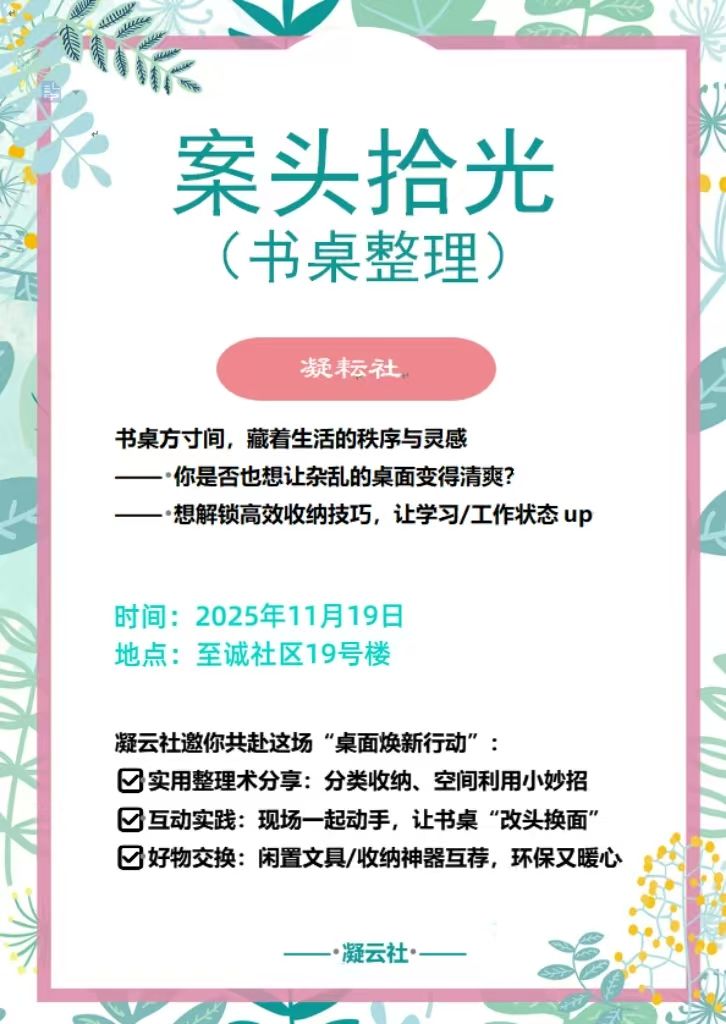 凝云社书桌焕新计划暖心开启!收纳妙招教学+现场动手改造+闲置物品互换三重体验,不仅帮你解锁高效收纳技能、打造清爽书桌,更传递环保理念,为社区生活增添实用与趣味兼具的成长记忆。