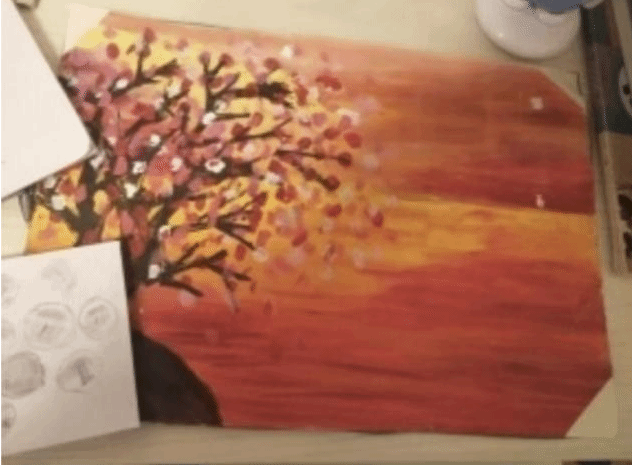作品简介:这幅画是母亲节我和我的爸爸一起完成的送给妈妈的礼物。我的妈妈好像每天都很忙碌,要管我们一家五口人,这张画里的每片“花瓣”都是我和爸爸用指尖蘸着颜料点上去的——他攥着我的小手,没干的颜料蹭在手腕上,像傍晚黏糊糊的风。画里的树是妈妈总说的“我们家的样子”,暖橙色的天是她每次加班回家亮着的灯。草稿纸上那些歪歪扭扭的圆,是我一开始想画的“妈妈的笑脸”,后来被爸爸改成了树上的光斑。现在它靠在玄关柜上,颜料味裹着刚晒好的被单香。我永远忘不了妈妈收到这幅画的神情。我希望我们一家人都可以永远开心