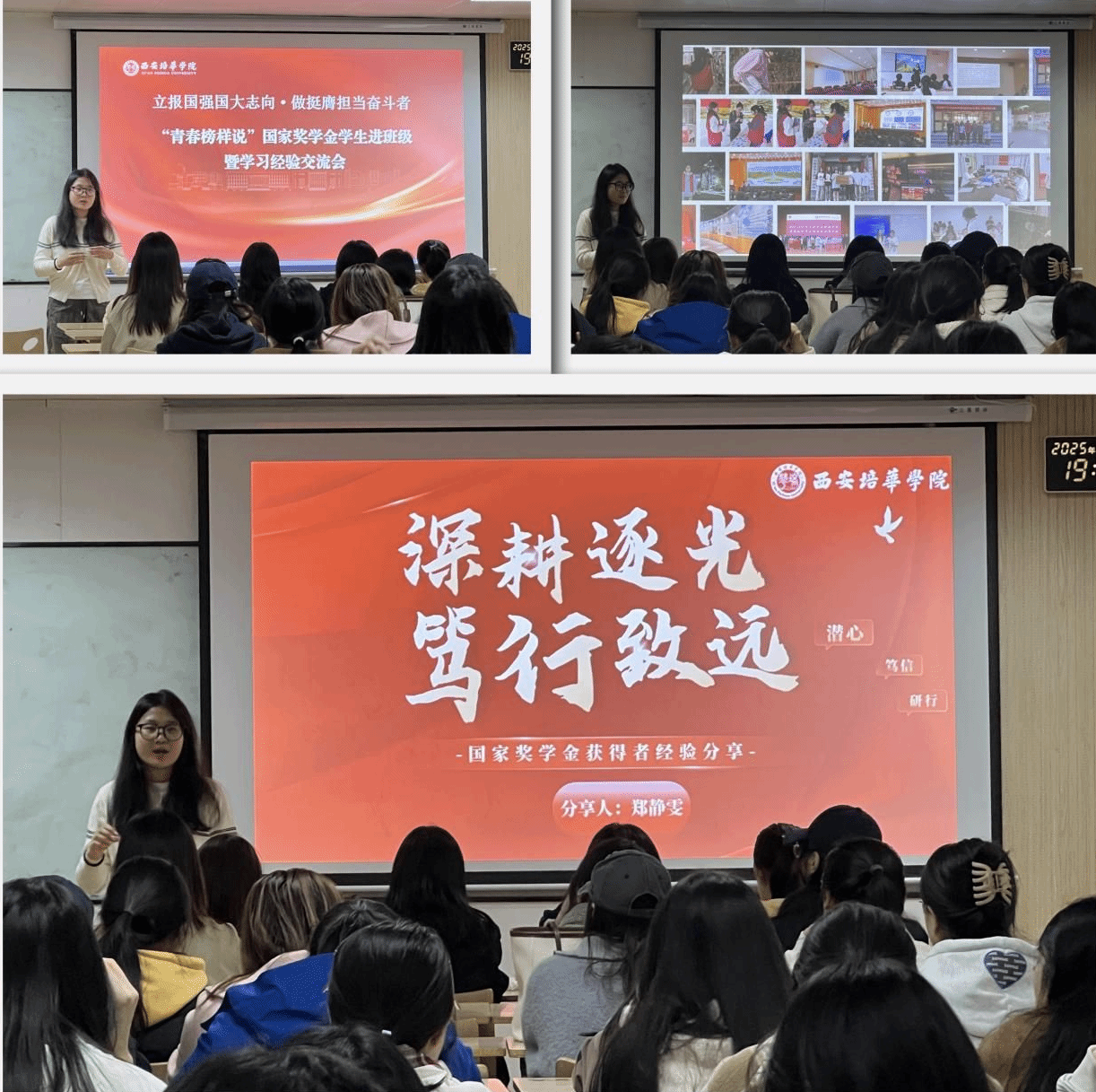 同专业2023级的郑静雯同学,则以“精准规划,高效执行”为关键词。她获2024年大学生新文科实践创新大赛省优秀奖、第十六届全国大学生数学竞赛省三等奖,参与的“旗”心燃梦队三下乡社会实践获“标兵团队”称号。作为“优秀学子回母校”活动重点立项团队成员,她撰写的实践案例被中华网、陕西青年网转载。“学习不是孤军奋战,而是找到适合自己的节奏。”她展示的“学科竞赛备赛策略”和“时间管理四象限表”,为新生提供了可复制的成长路径。