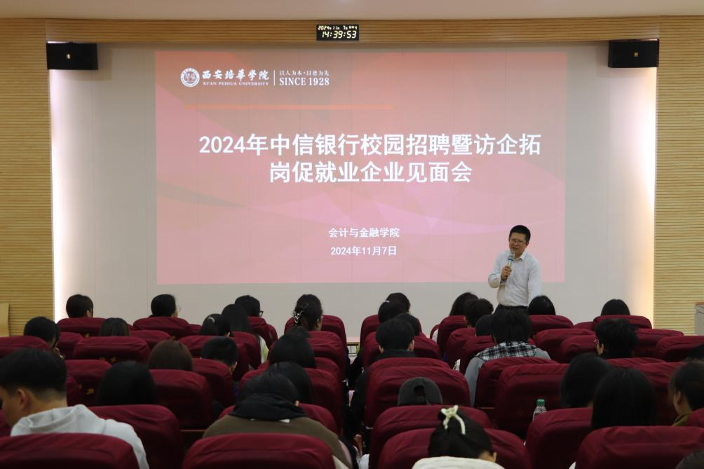 为进一步落实国家“促就业 稳就业”指导方针,稳固搭建大学生求职就业平台,2024年11月7日在博远楼J201 教室举办中信银行企业宣讲会。此次活动参加的领导有中信银行行长尹总、会计与金融学院党委书记刘斌以及毕业班辅导员。