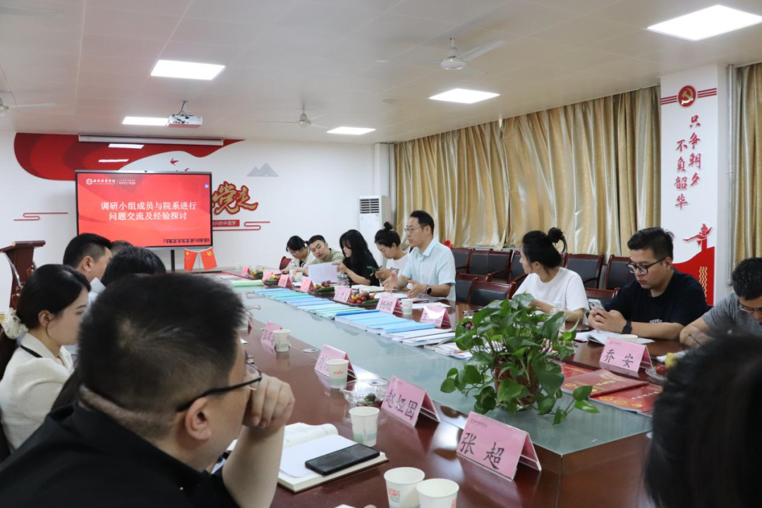 第二组,2113办公室辅导员座谈,学生服务中心主任权勇太、智能科学与工程学院辅导员李煜、法学院辅导员梁睿与我院抽调的5名辅导员就姜维之班创建中考研率和班级情况进行座谈,大家根据提出的问题畅所欲言,展示自己的做法,分享各自的经验与感悟;
