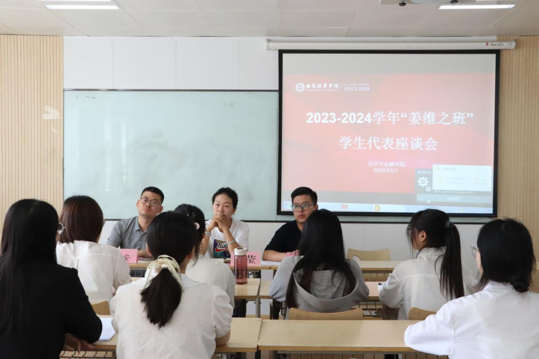 2024 年 6 月 18 日 上午10:30 至 12:00,2023-2024 学年“姜维之班”中期走访调研会在博远楼 2115 会议室如期开展。此次会议犹如一座沟通与交流的桥梁,紧密连接着学校与学院,旨在对会计与金融学院“姜维之班”的创建工作进行全面且深入的详尽汇报以及广泛交流。
