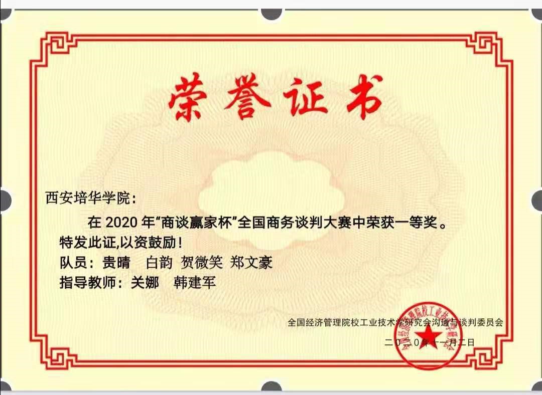 4、2020年11月,荣获“全国商务谈判大赛”国家级一等奖;