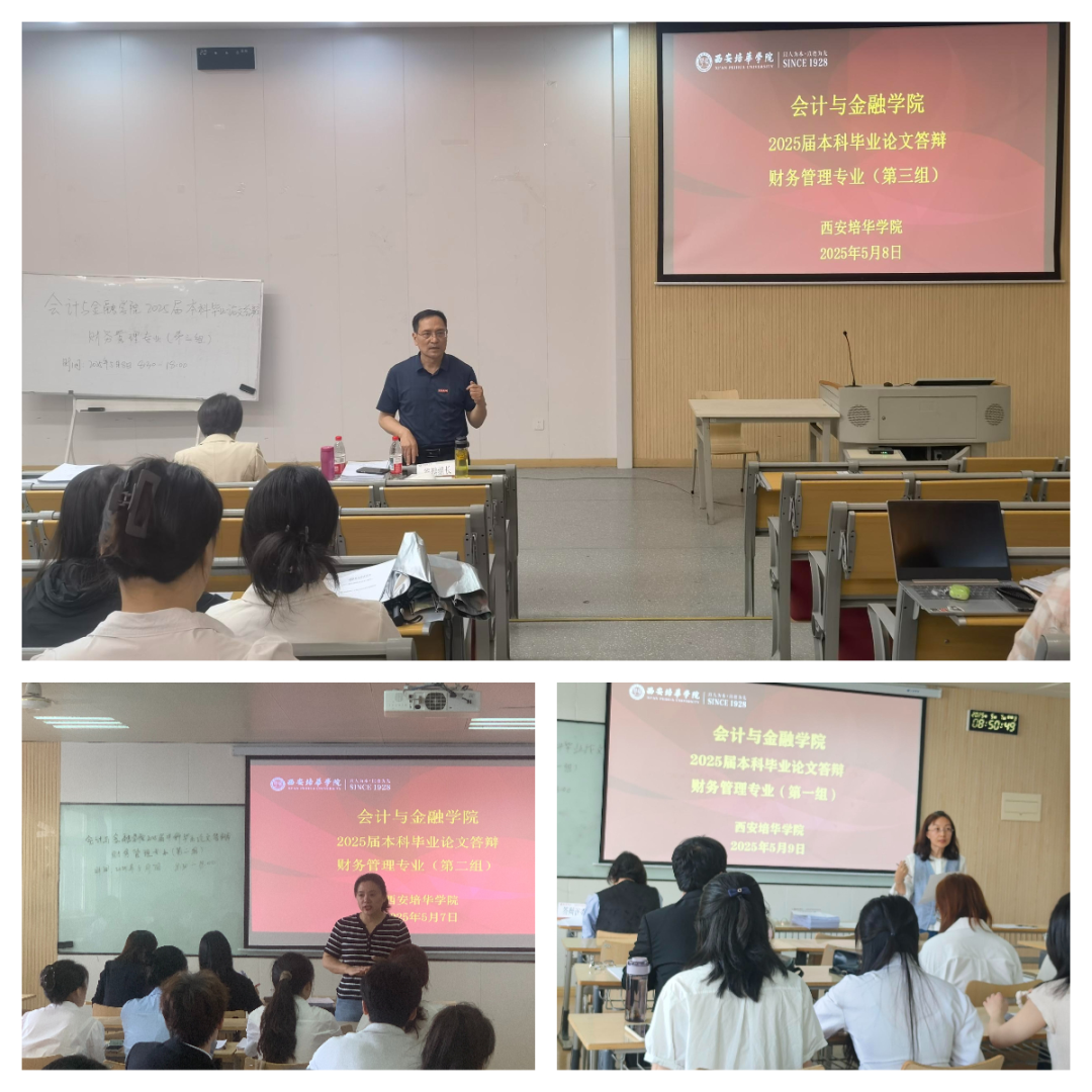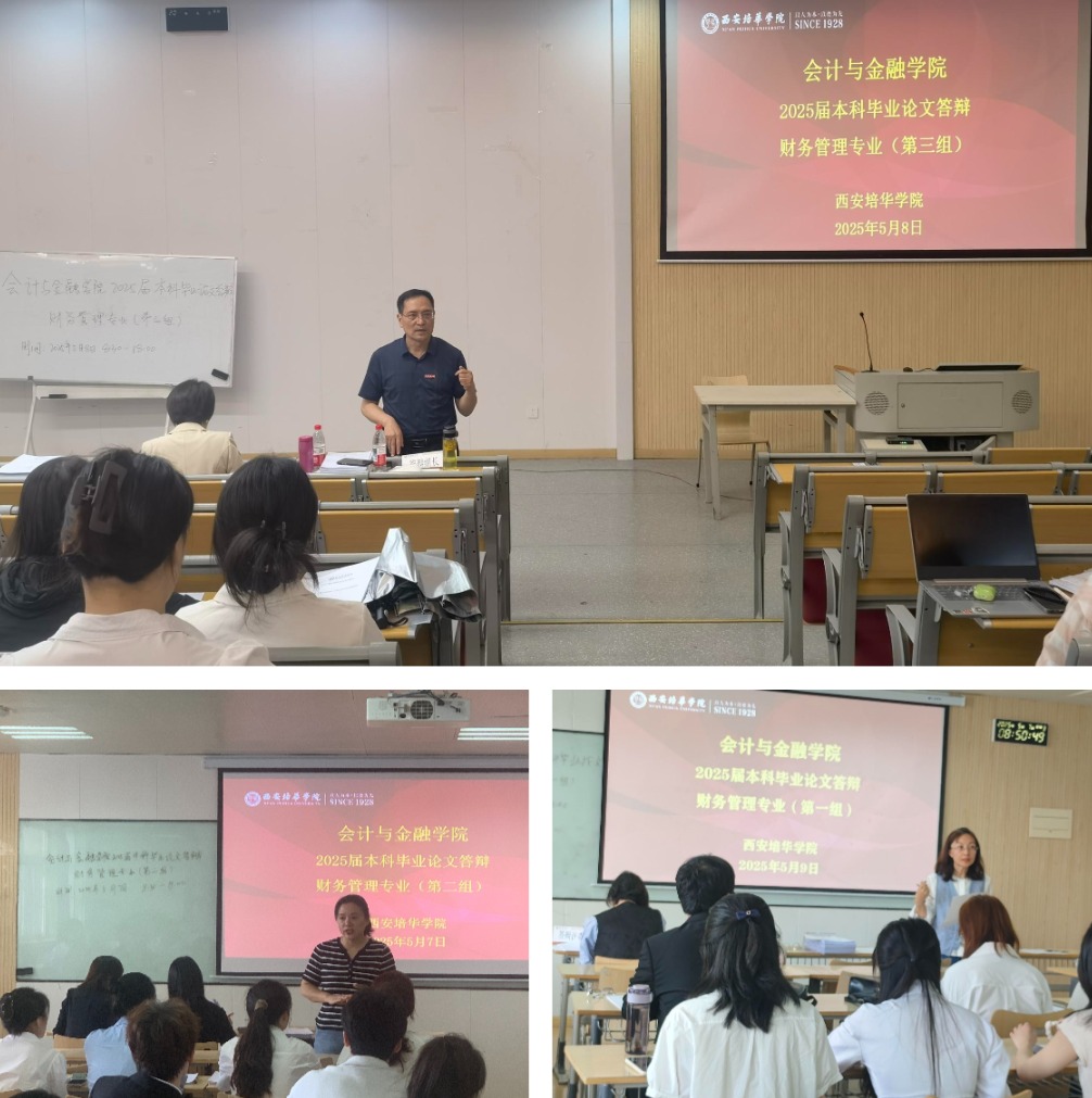 根据《西安培华学院本科毕业论文(设计)工作管理办法》《西安培华学院本科毕业论文(设计)答辩工作实施细则》等文件精神和要求,会计与金融学院财务管理专业于2025年5月7、8、9三日分别在博远楼2210、2211、3506和2211教室举行了2025届本科毕业生论文答辩,共16位教师和98名学生参加了此次答辩。本次财务管理专业论文答辩共分为四组,每组由答辩组长一名、答辩评委两名和答辩秘书一名组成。