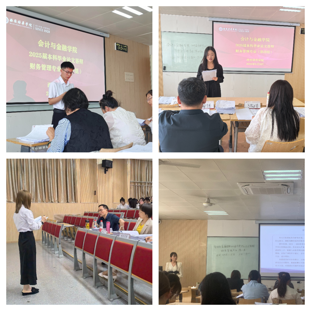 其次,学生进行答辩。参加答辩的学生在经历过论文开题、中期检查、 论文重复率检测、AIGCJ检测以及校外盲审等几个阶段的审查后,方能有资格进入正式答辩环节。学生对论文内容梳理提炼,按照要求以PPT形式进行展示和陈述,汇报内容包括选题意义、背景,理论框架、研究方法及主要研究内容等。答辩过程中,学生仪态端庄大方,精神饱满积极,条理清晰地阐述论文的主要观点、研究内容、研究不足及结论等。针对研究的问题,从不同角度进行了专业性陈述,展示了一定的专业素养和能力,同时也展现出我们培养的财务管理人才的整体精神面貌。