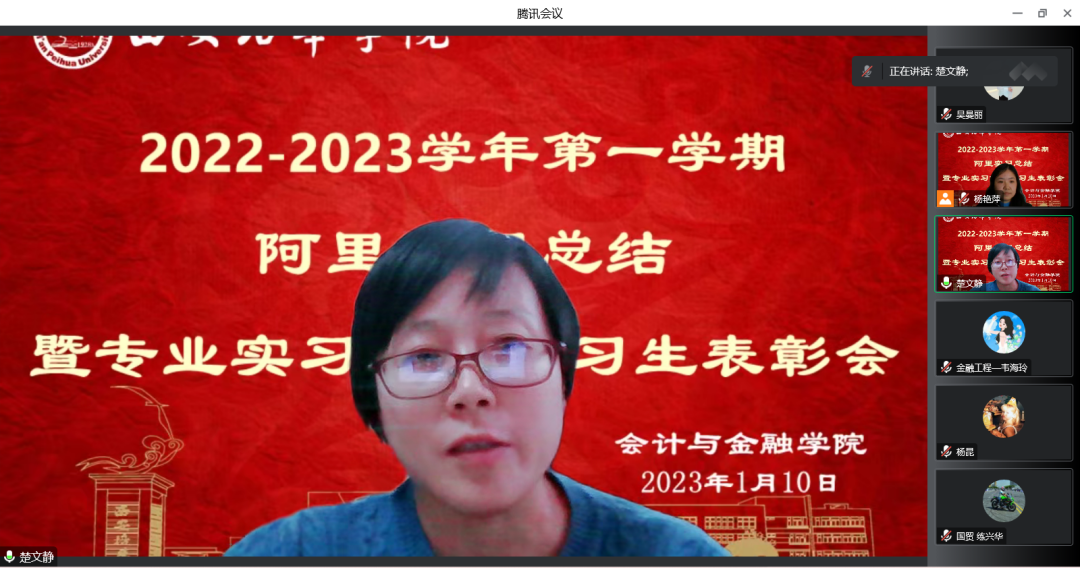 会计与金融学院数智营销系、经济系师生于2023年1月10日下午16时于腾讯会议召开阿里项目实习总结暨专业实习优秀实习生表彰会,会议由市场营销专业杨艳萍老师主持,与会邀请了产学研副院长丁阳教授、数智系主任李亚子教授,副主任刘茹岚老师、市场营销、电子商务、金融工程及国际贸易专业实习负责老师,参与本次实习的其他指导老师及全体学生。