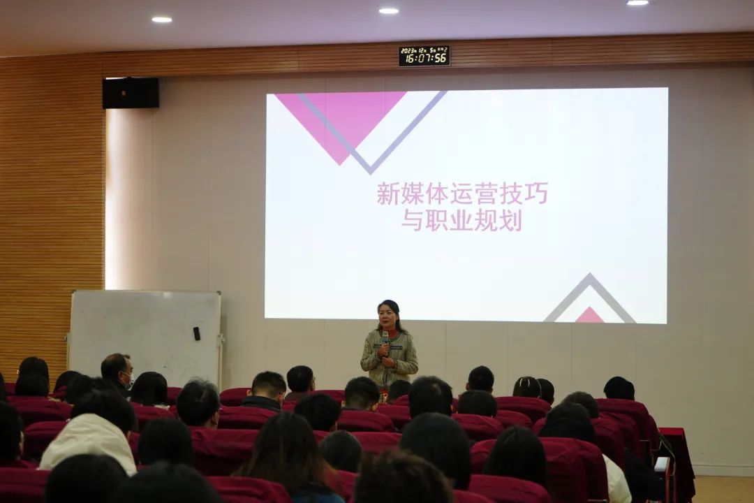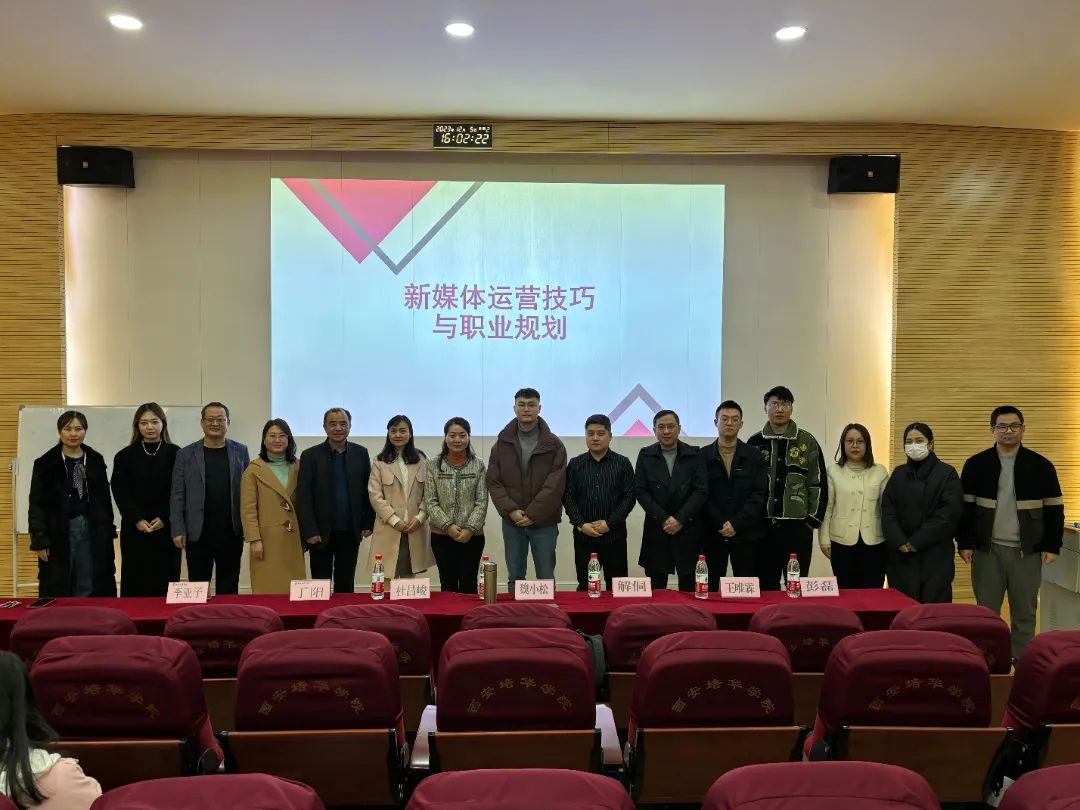 为促进市场营销、电子商务专业应用型人才培养,西安培华学院会计与金融学院数智营销系于2023年12月5日下午4点在博远楼J201成功举办了以"新媒体运营技巧及职业规划--企业家进课堂"为主题的讲座,主讲人为陕西念雷知一电子商务有限公司商务总监——王唯霖。念雷知一总经理杜昌峻带领公司相关工作人员共同助力此次讲座,本次讲座不仅深入探讨电商新兴业态的发展趋势、岗位需求和直播带货实时数据,而且聚焦电商直播领域,为在校师生提供了更为全面深刻的行业洞察。此次讲座由会计与金融学院丁阳副院长、数智营销系李亚子主任以及全体教师与电子商务、市场营销学生共同参与一起探究电商新趋势。