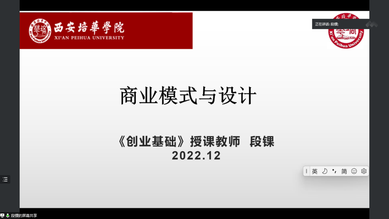 2022年12月14日下午,西安培华学院创新创业教研室举办了线上《创业基础》课程教学创新大赛,参加本次大赛的有创新创业教研室任课教师。西安培华学院教务管理中心刘斌主任、会计与金融学院杨仕鹏、丁阳副院长,西安培华学院创新创业教研室主任江凤香副教授,以及西安培华学院创新创业教研室所有老师观看了本次大赛,大赛由江凤香副教授主持。担当本次大赛的评委老师有杨仕鹏副院长、史立军副院长、丁阳副院长、杨柏欢教授、江凤香教授。