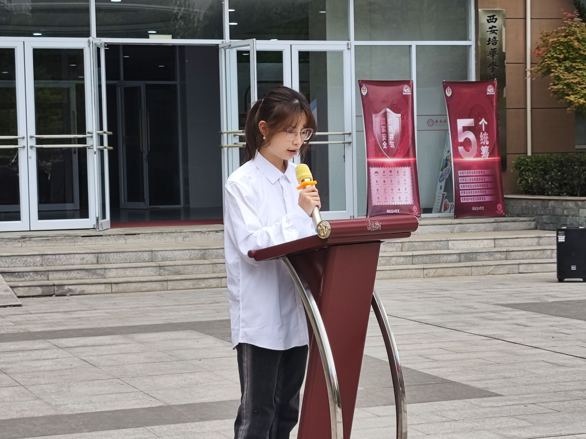 活动中,赵洁副院长深入解读了总体国家安全观的内涵和重要性,并结合学院实际情况,提出了加强校园安全建设的具体措施。随后,学生代表左浩宇同学带领全体师生进行宣誓。最后,学生代表张灿同学结合自身的学习和生活经历发表了主题发言。