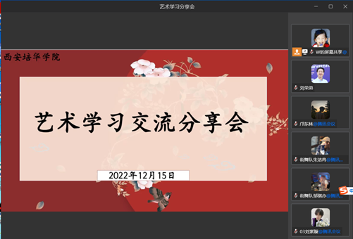 为积极推动我校美育教育教学,激发我校学生学习艺术的兴趣爱好,同时全面了解学生们的学习状态,2022年12月15日,西安培华学院艺术教育中心面向大学生艺术社团学生举办了舞蹈学习交流分享会。本次分享会因疫情在线上进行,由卫梓琪老师主持,艺术教育中心全体教师及艺术社团舞蹈队近百余名成员参加。