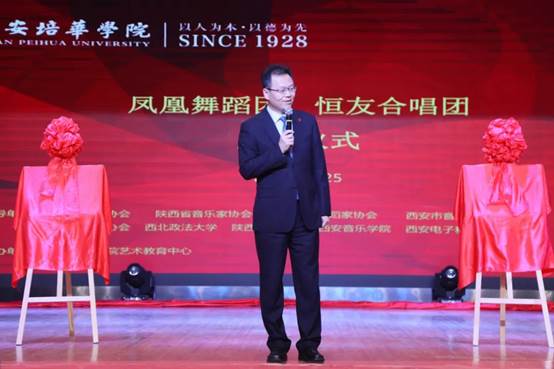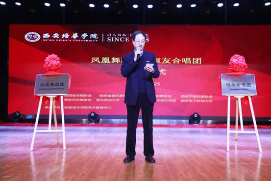 姜波理事长致辞:恒友合唱团和凤凰舞蹈团在成立之前就有着独特的校园风采,不仅绽放在校内外的各大舞台上,更绽放在今天这个充满青春活力的舞台上。恒友之名意义深远,不仅代表永恒的朋友,更是用父亲姜哲先生的字纪念培华几代人的心血和青春。他宣布西安培华学院凤凰舞蹈团、恒友合唱团正式成立,希望今后能为恒友而歌,像凤凰般舞。走向更丰富、更广阔的人生大舞台。