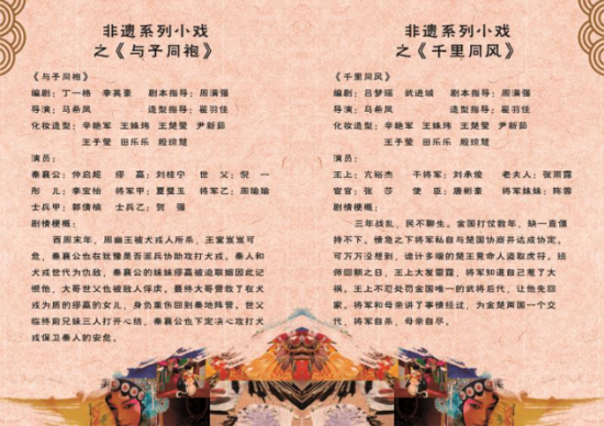 第二场表演的非遗剧目为《千里同风》,故事讲述了三年战乱,民不聊生。金国打仗数年,却一直僵持不下。情急之下将军私自与楚国协商并达成协定。可万万没想到,诡计多端的楚王竟命人盗取虎符。将军班师回朝之日,王上大发雷霆,将军自知闯下大祸。但王上不忍处罚金国唯一的武将后代,便让其先回家。将军归家以后,与其母亲讲述了事情的经过,为给金楚两国一个交代,将军与母亲双双自尽。