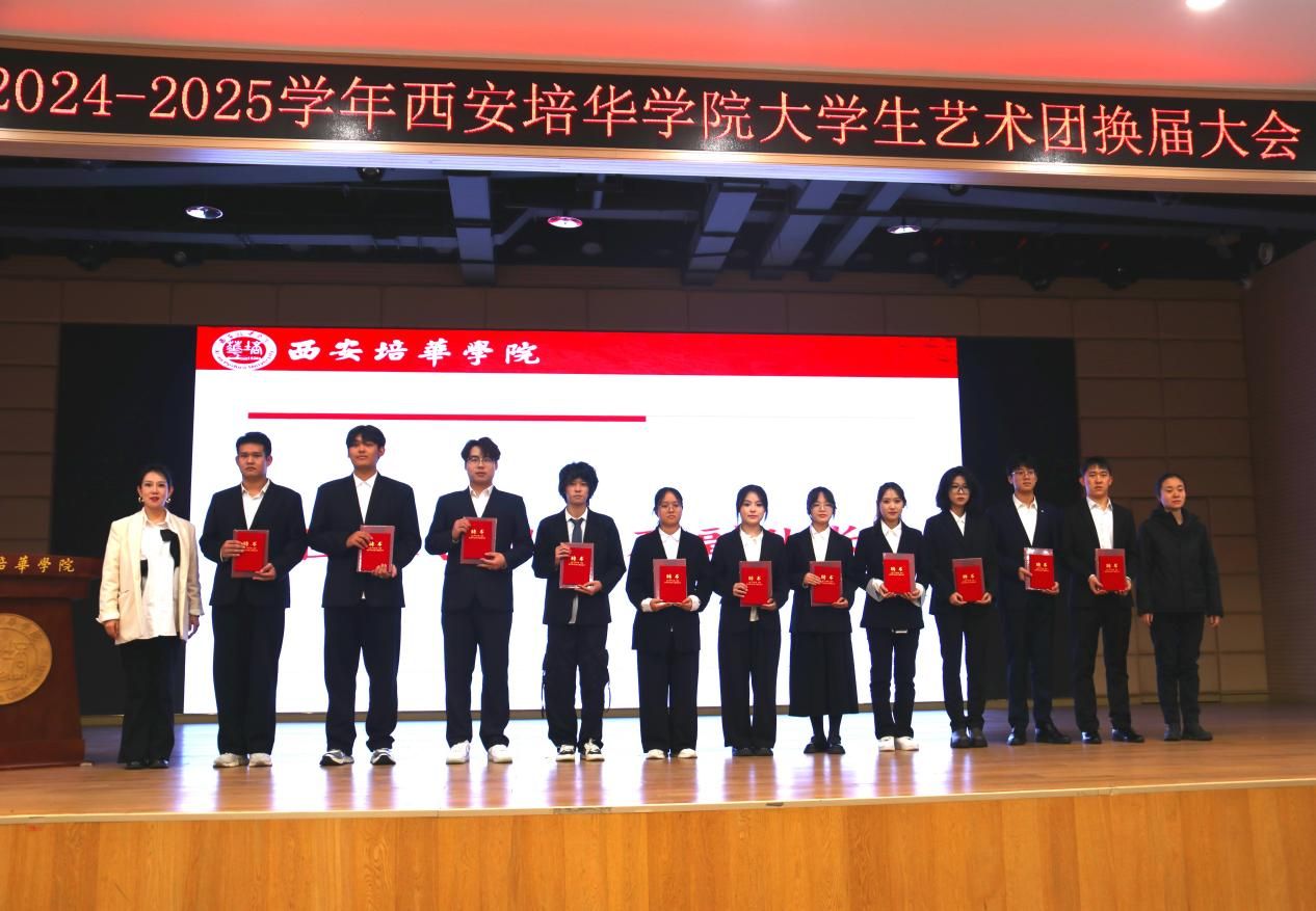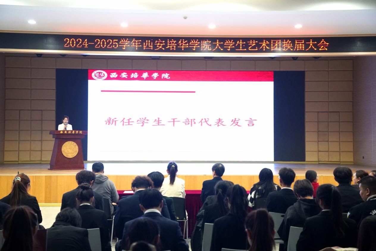 精诚所至,金石为开。换届在即,激情澎湃。2024年11月21日19:00西安培华学院大学生艺术团2024-2025学年换届大会在恒友楼四楼报告厅隆重举行。主持人首先介绍出席本次大会的领导及老师们,他们分别是艺术教育中心主任刘荣弟教授,艺术教育中心张茹老师、雷孟颖祎老师、张靖雯老师、齐堃老师、刘晗悦老师、李龙老师和宋亚平老师,以及大学生艺术团各队学生代表150余人。