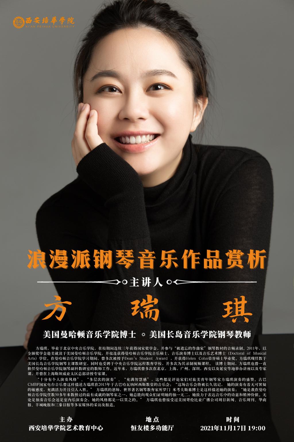 2021年11月17日19:00,西安培华学院艺术教育中心第七期名家艺术讲坛将在恒友楼汇报厅举行。本次艺术讲坛邀请旅美青年钢琴家、美国曼哈顿音乐学院音乐演奏、艺术双博士,美国长岛音乐学院钢琴教师方瑞琪女士,她为我校师生带来题为“疯狂”的音乐家——罗伯特•舒曼钢琴作品赏析的讲座。方瑞琪常年活跃于中国,美国,西班牙,法国,古巴,巴拿马等世界知名艺术中心。她曾成功在北京音乐厅,北京中山音乐堂,中国国家大剧院,北京国家图书馆音乐厅,台北国家音乐厅,纽约卡内基音乐厅威尔独奏厅等举办了独奏会及室内乐演奏会,并多次与交响乐队合作演奏钢琴协奏曲,其中包括曼哈顿室内乐交响乐团,曼哈顿铜管乐团及古巴国家交响乐团等。“十分有个人演奏风格”、“多层次的演奏”、“充满智慧感”,这些都是评论家们对旅美青年钢琴家方瑞琪演奏的盛赞。