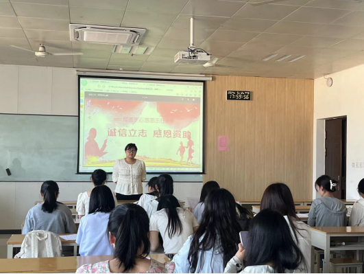 为深入贯彻落实党的二十大精神和习近平总书记关于教育的重要论述,深入推进资助育人成效,增强当代大学生的诚信意识和责任担当,围绕立德树人根本任务,弘扬中华传统诚信文化精髓,我院于2024年5年月12日开展以“诚信立志,感恩资助”为主题的诚信教育主题班会。