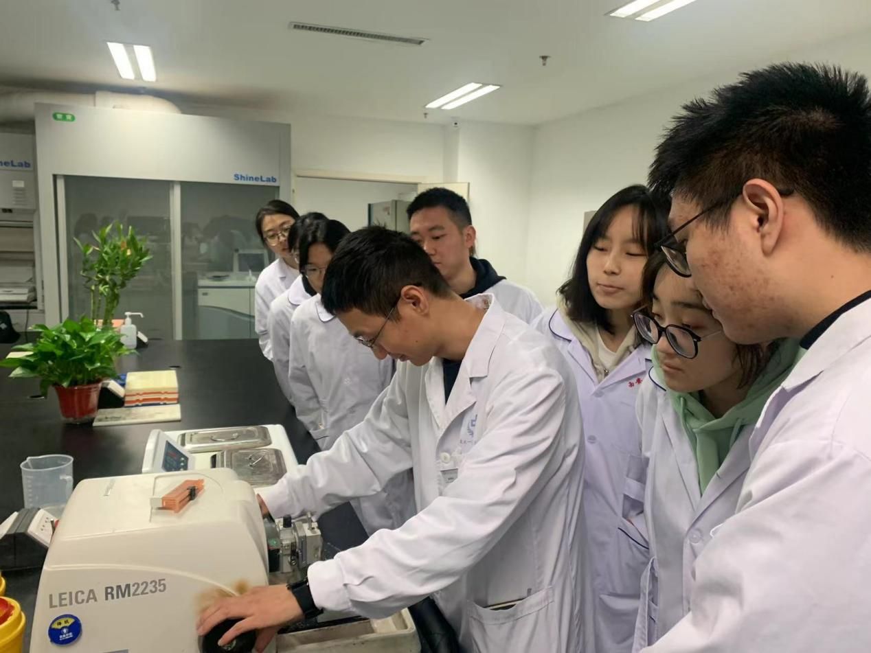 在康丽丽、付同亮等老师指导下,同学们分组观摩了从标本接收、制片到染色的完整病理工作流程。抽象的“石蜡包埋”、“HE染色”等术语化为直观操作,令同学们深感震撼。带教老师还结合临床案例,讲解了病理报告如何指导护理实践,同学们就标本采集、报告解读等实际问题与老师进行了热烈交流。