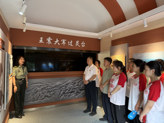 夕阳照在灵台工委纪念馆。队员们屏息凝神,在珍贵的老照片前久久默立。照片里斑驳印记与陈列的革命斗争遗物,无言诉说着革命先烈前赴后继的战斗身影。