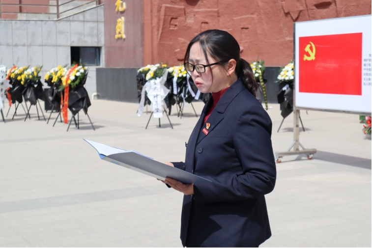 "我志愿加入中国共产党......"在纪念碑前,全体党员面向党旗,举起右拳,在学生第二党支部书记冯贝同志的领誓下重温入党誓词。铿锵有力的誓言在陵园上空回荡,表达了新时代医学生党员继承先烈遗志、践行初心使命的坚定信念。