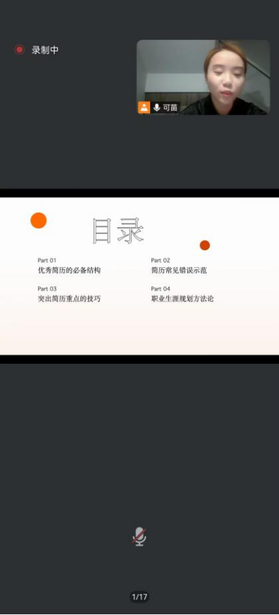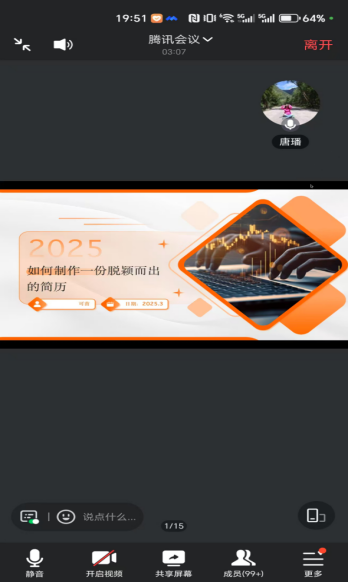 在当今竞争激烈的就业市场中,一份出色的简历如一块敲门砖。为了帮助同学们打开理想职业的大门,医学院特邀可苗老师于3月13日19:30通过线上会议为2025届毕业生进行就业指导讲座,本次活动由医学院学生干事唐璠老师主持,2025届学生代表参会。