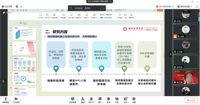 药学专业同样抽取了30名学生,在腾讯会议平台开展了线上答辩。答辩过程中,学生们准备充分,思路清晰,详细阐述了论文的选题背景、研究目的和意义、研究方法、预期成果和创新点及进度安排。答辩小组老师根据学生的开题汇报,认真点评并指出存在的问题,提出修改建议,为学生们的毕业论文撰写提供了宝贵的指导。