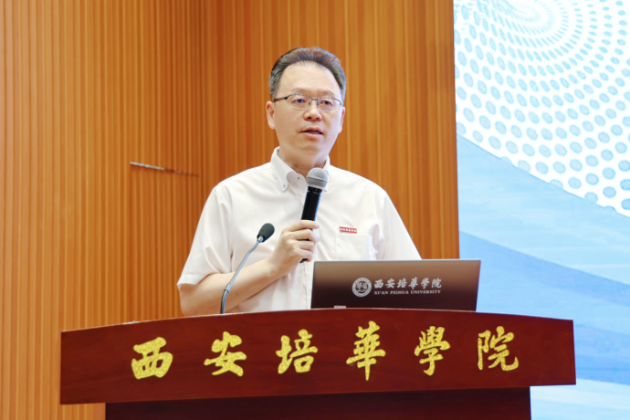 西安培华学院理事长姜波博士致辞,他首先对与会的专家、嘉宾表示热烈欢迎,同时感谢我校附属医院、教学医院、实习医院及参会单位对我校多年来医学教育教学的大力支持。他强调指出:一是医疗康养一体化不仅仅是产业发展的趋势,更是满足人民日益增长的健康需求,我们需要坚持“以人为本”的发展理念,以科技为引领,以政策为支撑,以市场需求为导向,推动医疗康养产业向更高质量、更深层次的融合与发展;二是热切的邀请各位专家、兄弟院校、医疗机构和科研院所共同支持并参与培华在健康事业和健康产业方面的建设,为康养产业的发展贡献力量;三是我校正在积极推动与兄弟院校、医疗机构的深度合作,特别是深化与附属医院的紧密合作,旨在构建一个整合培华医校资源的全方位人才培养平台,推进医学领域的产业学院建设。