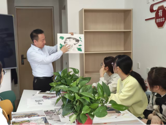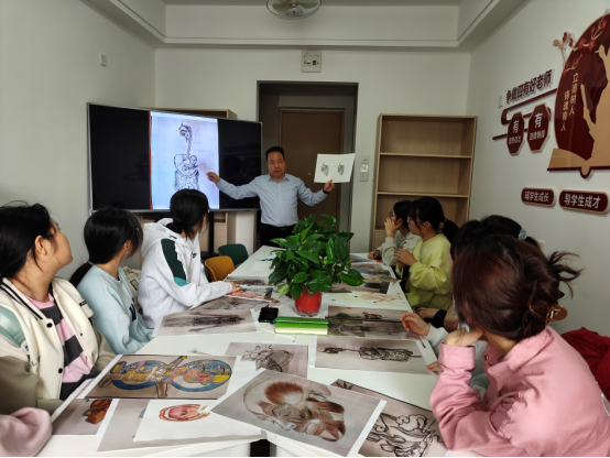 2024年4月2日基础系马怀芬主任,学生素质发展中心尚丛珊老师带着百余幅全国解剖图大赛获奖作品走进至善社区与医学生交流解剖绘图比赛心得。其中基础系教师金建成全程为学生讲授解剖绘图知识,深入浅出,图文并茂,为同学带来了一场“医”与“美”的创意碰撞,深受学生欢迎。同学们也一改课堂上的羞涩,大胆的和老师们讨论解剖绘图的知识和灵感。